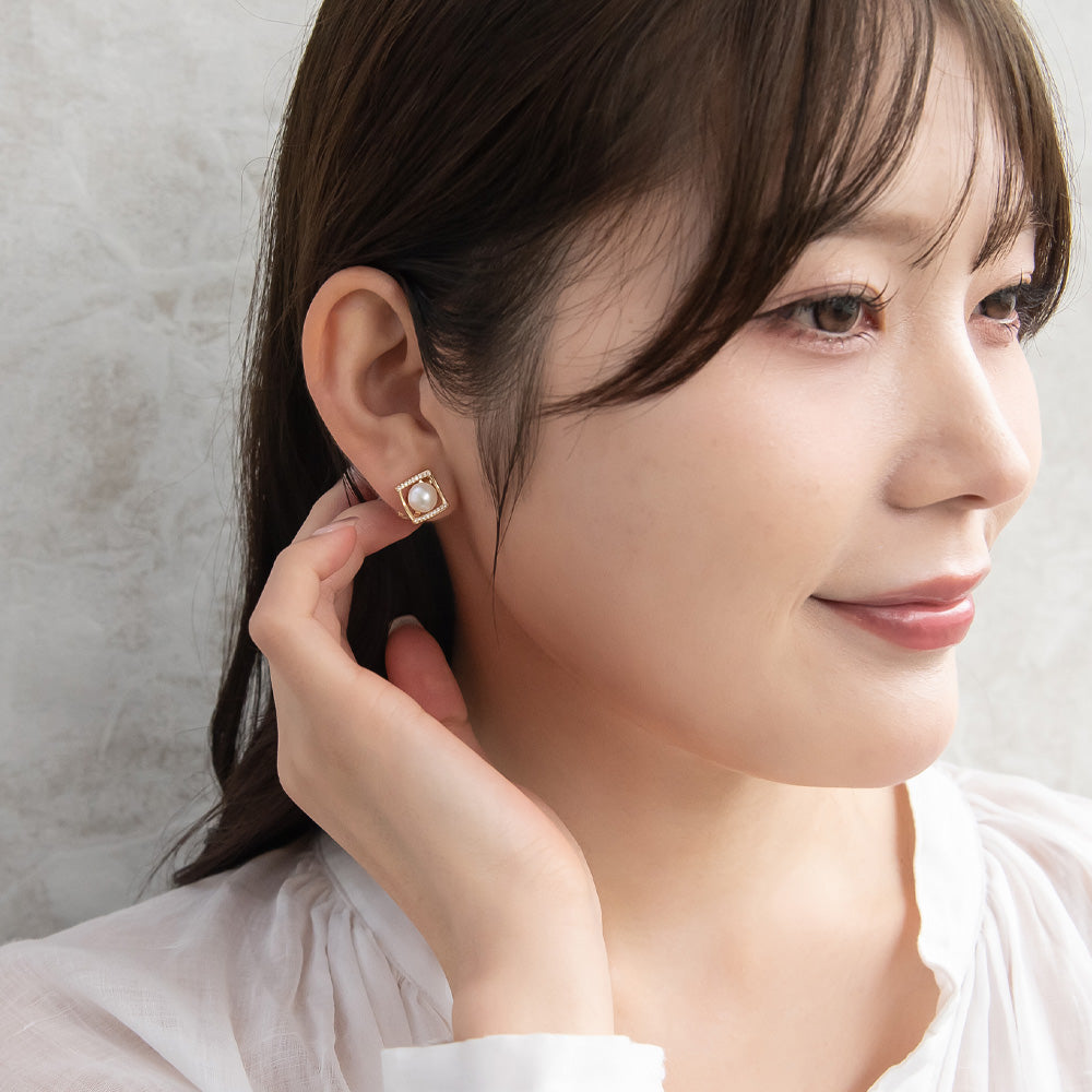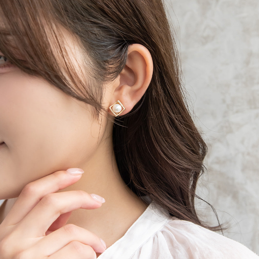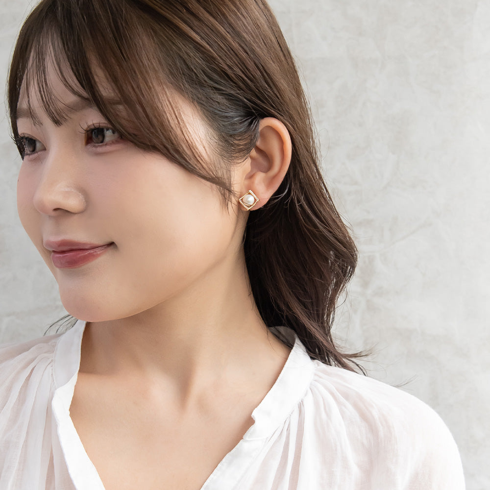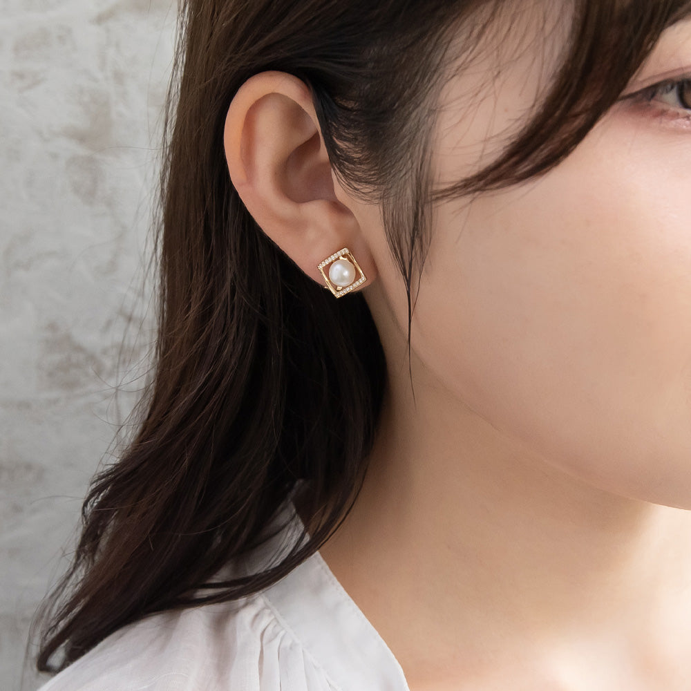 er1065やわらかくなめらかな輝きを放つ、淡水パールのアクセサリー。美しさが引き立つ、キュービックジルコニアを贅沢にあしらったメタルフレームのイヤリング。華やかに品よく、いつものスタイリングを格上げしてくれるパールのアイテム。