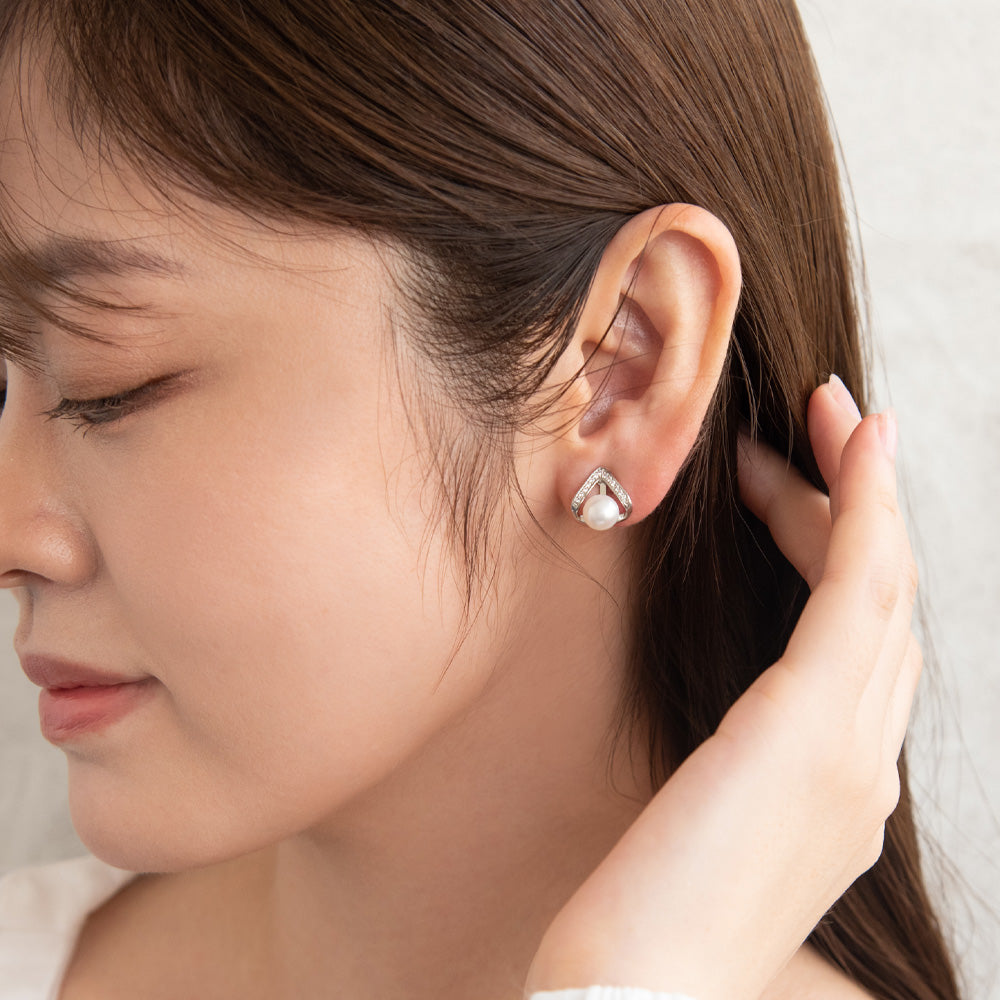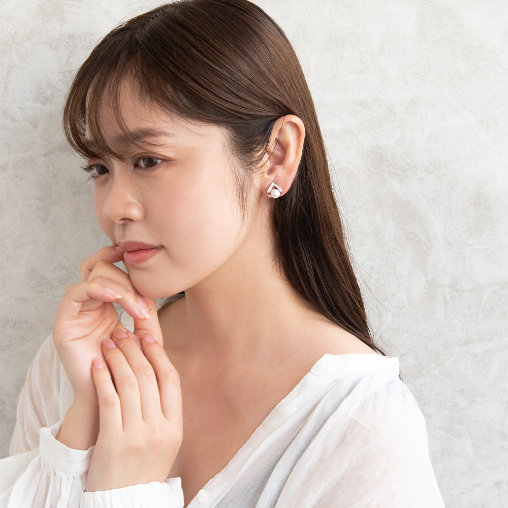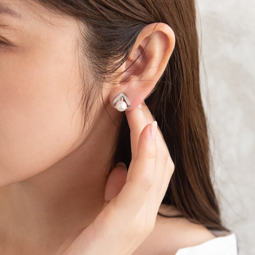 er1067やわらかくなめらかな輝きを放つ、淡水パールのアクセサリー。美しさが引き立つ、キュービックジルコニアを贅沢にあしらったメタルフレームのイヤリング。華やかに品よく、いつものスタイリングを格上げしてくれるパールのアイテム。