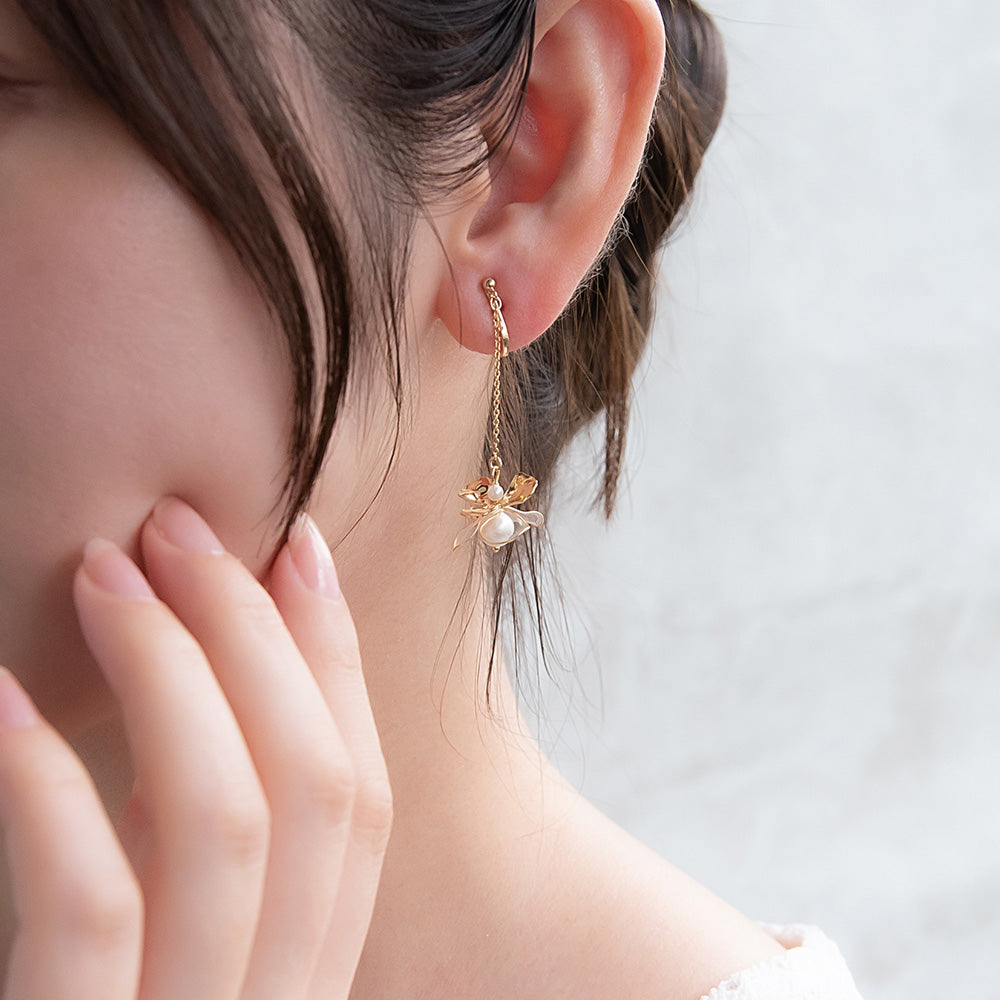 Classy イヤリング ニッケルフリー メタル ワイヤー フラワー 半透明 パール チェーン 下がり ネジバネ式イヤリング