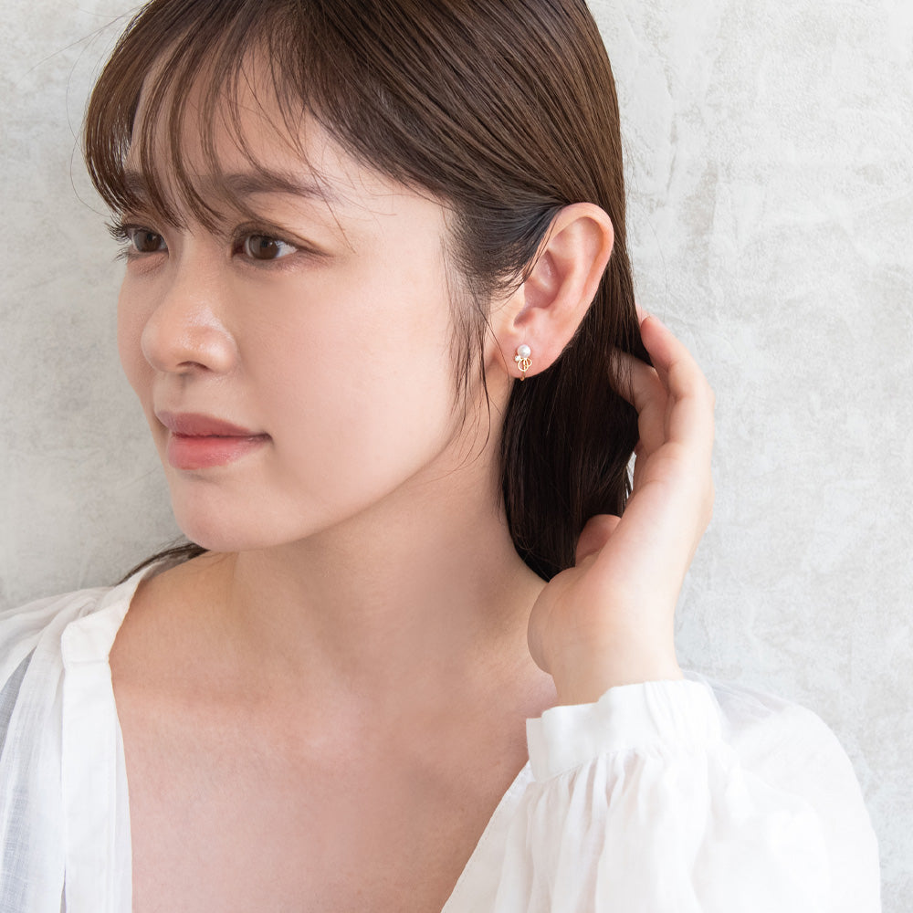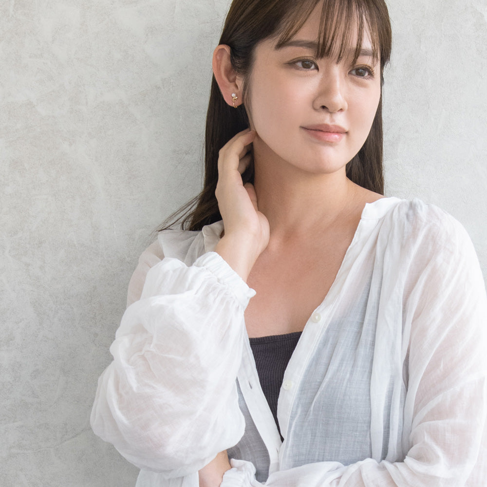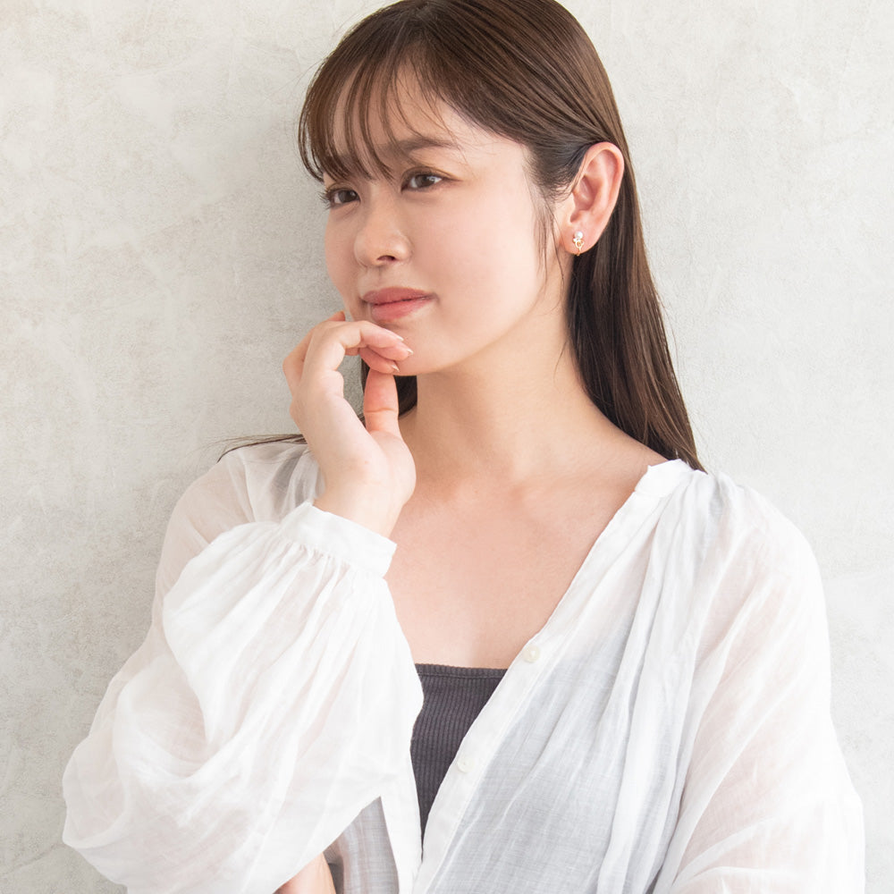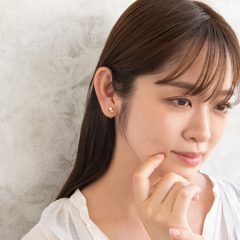 er1077耳元でさりげなく輝く小ぶりで上品なデザイン、コーデの質を上げるきれいめイヤリング。デイリー使いしやすい華奢めなデザインは、落ち着きのある上品な印象で幅広いスタイリングによく合います。目立ちにくくスッキリとした、お肌に優しい華奢な金具を使用したイヤリングです。