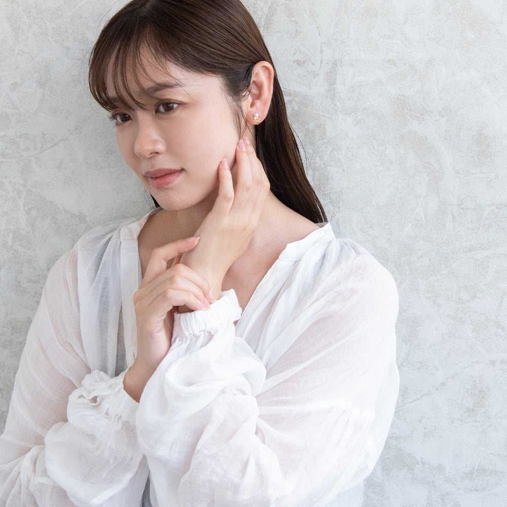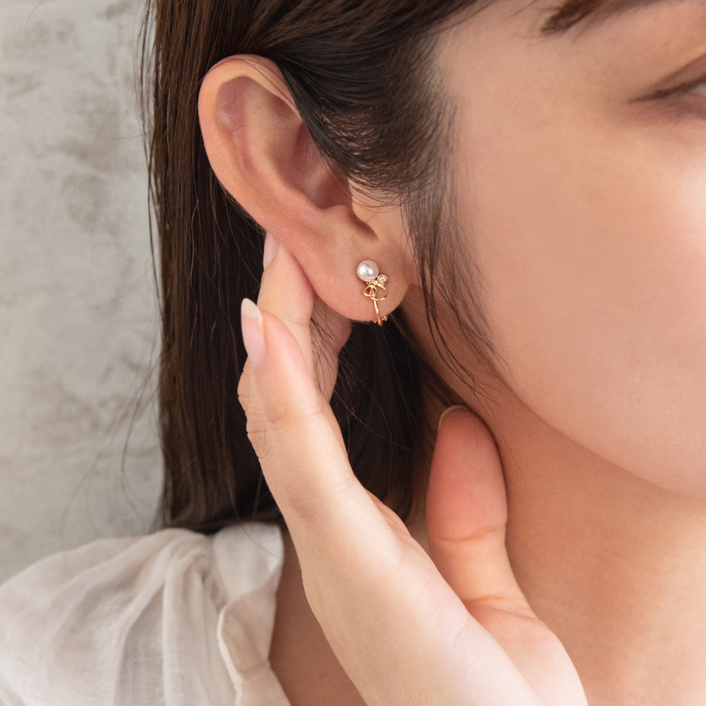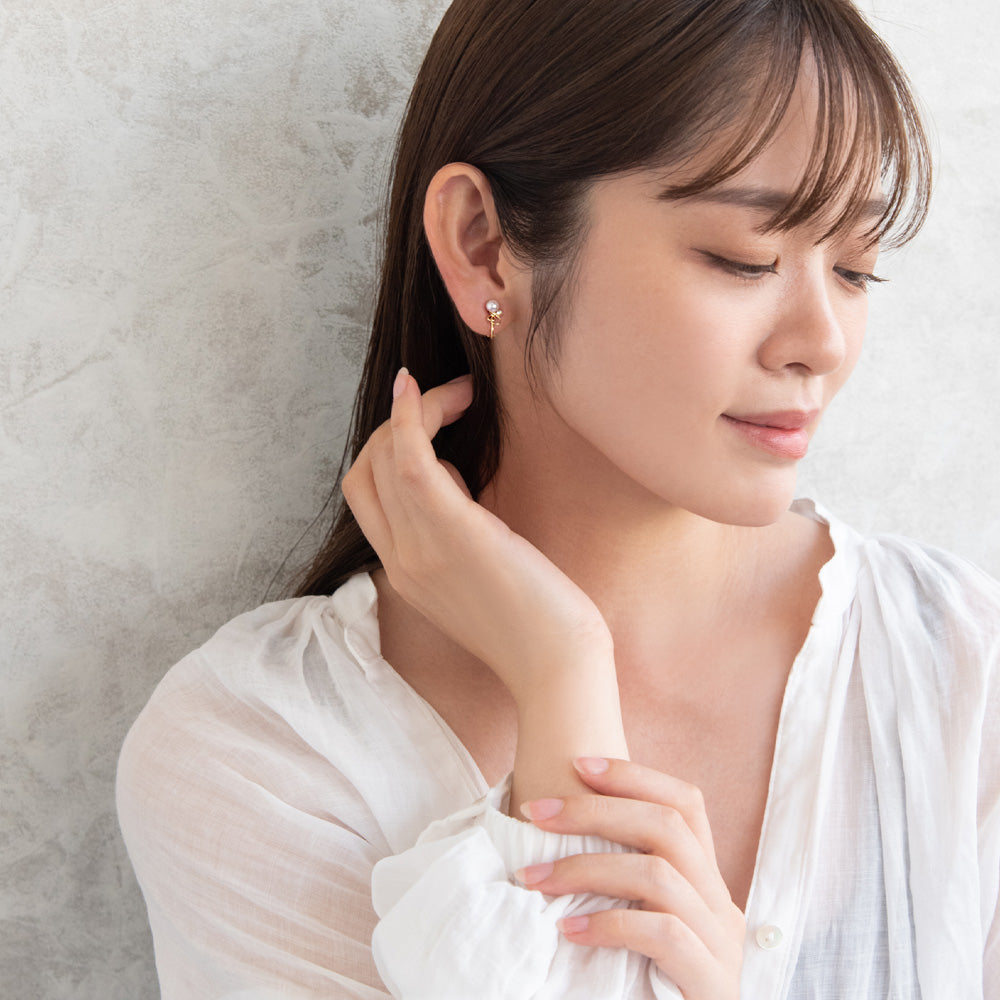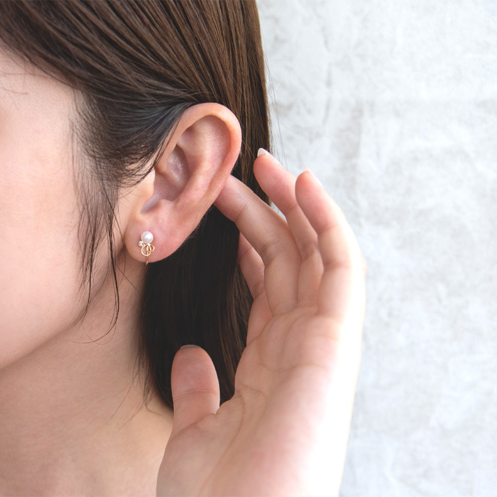 er1077耳元でさりげなく輝く小ぶりで上品なデザイン、コーデの質を上げるきれいめイヤリング。デイリー使いしやすい華奢めなデザインは、落ち着きのある上品な印象で幅広いスタイリングによく合います。目立ちにくくスッキリとした、お肌に優しい華奢な金具を使用したイヤリングです。
