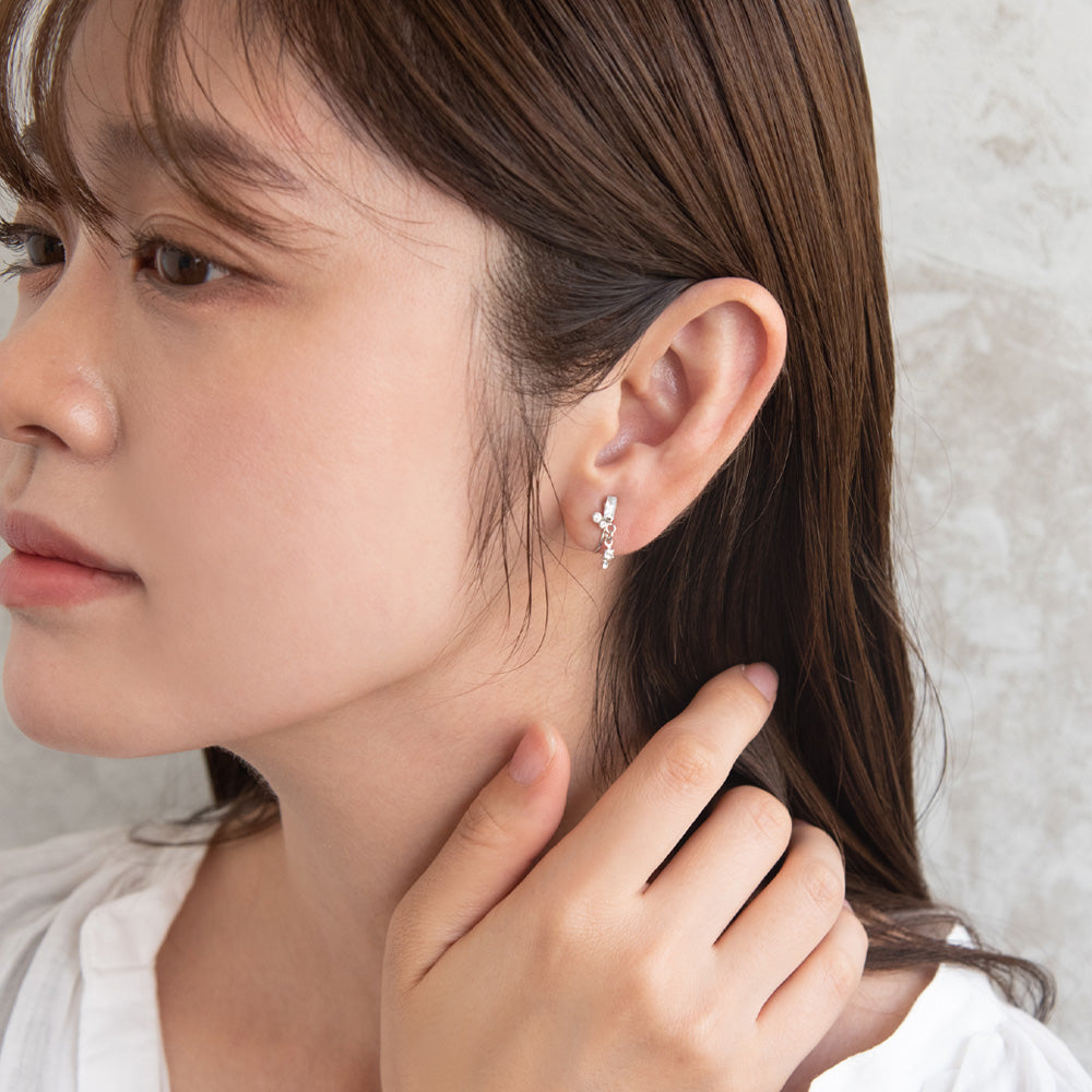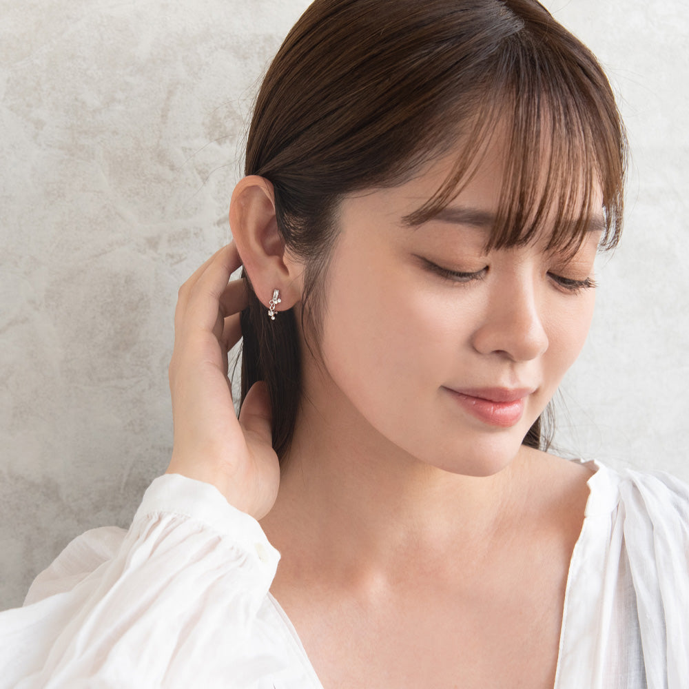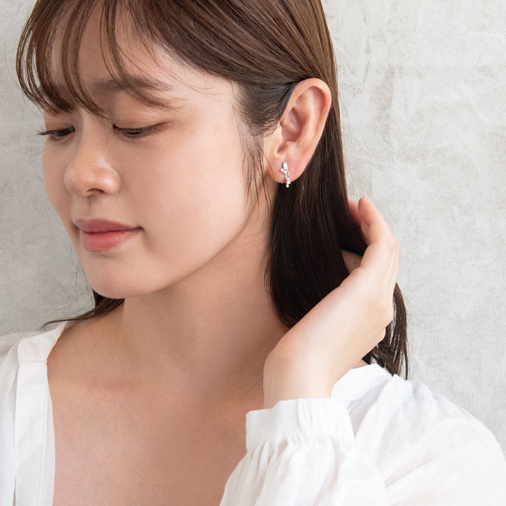 er1079耳元でさりげなく輝く小ぶりで上品なデザイン、コーデの質を上げるきれいめイヤリング。デイリー使いしやすい華奢めなデザインは、落ち着きのある上品な印象で幅広いスタイリングによく合います。目立ちにくくスッキリとした、お肌に優しい華奢な金具を使用したイヤリングです。