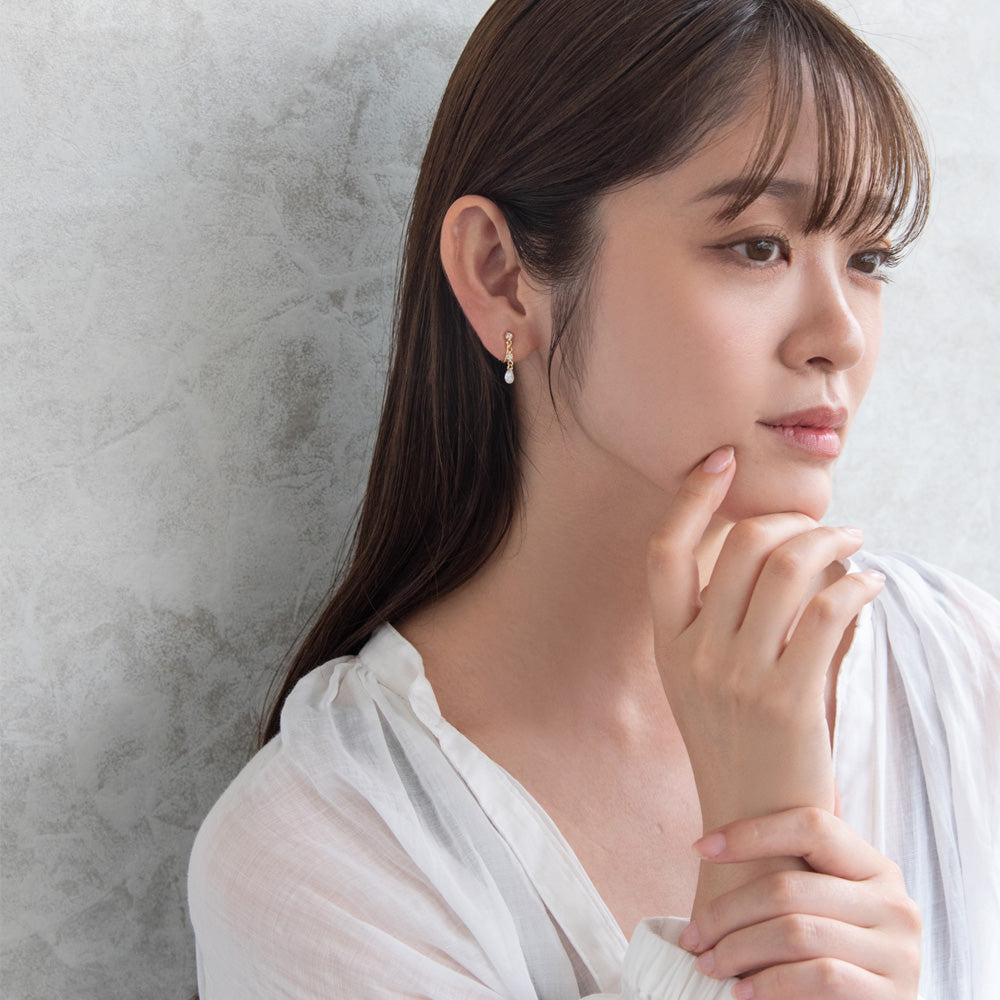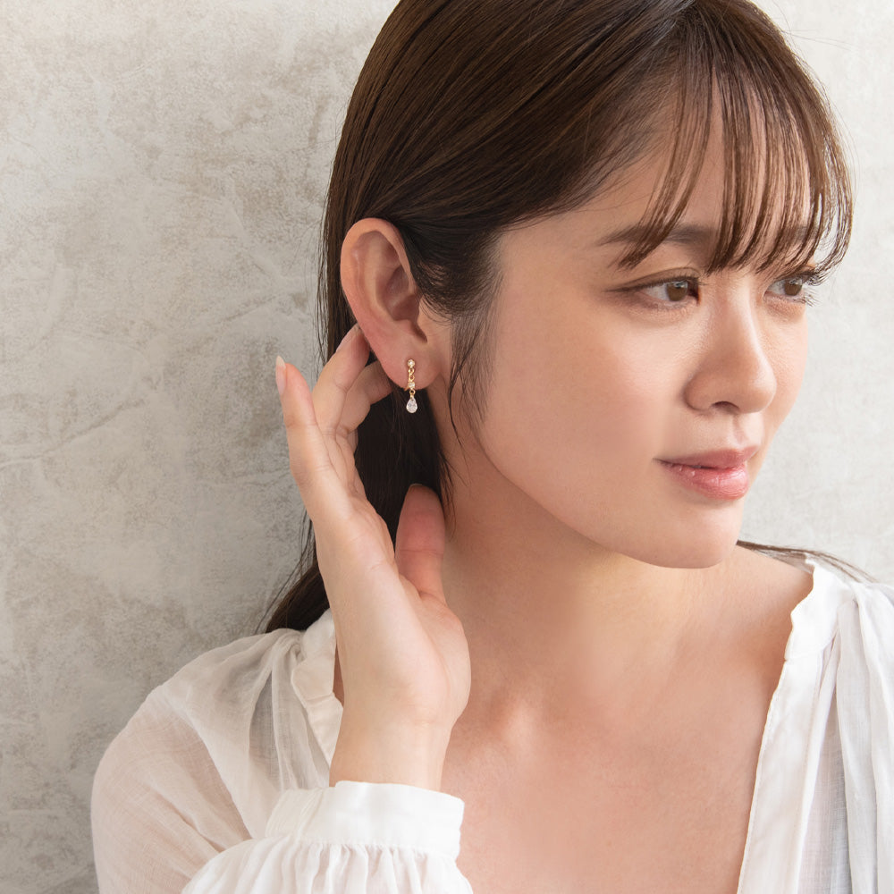 er1081耳元でさりげなく輝く小ぶりで上品なデザイン、コーデの質を上げるきれいめイヤリング。デイリー使いしやすい華奢めなデザインは、落ち着きのある上品な印象で幅広いスタイリングによく合います。目立ちにくくスッキリとした、お肌に優しい華奢な金具を使用したイヤリングです。