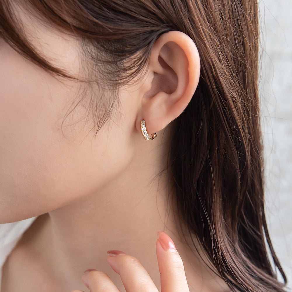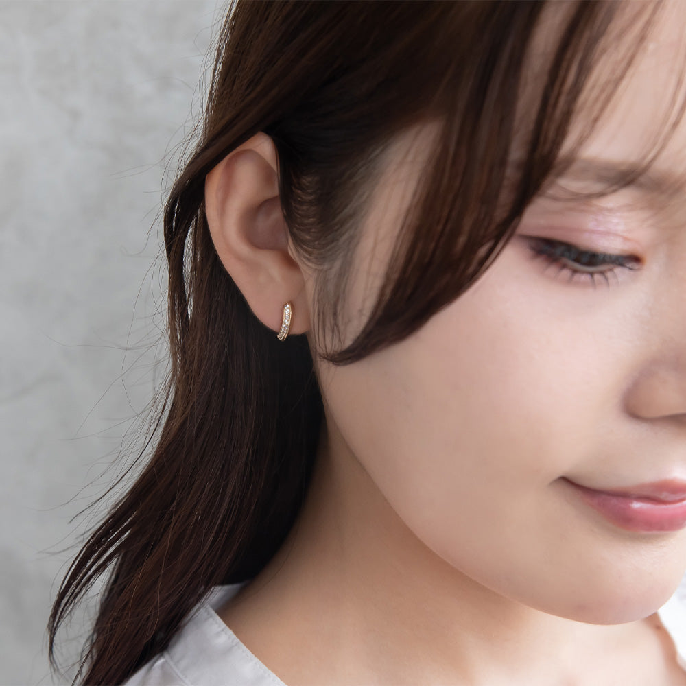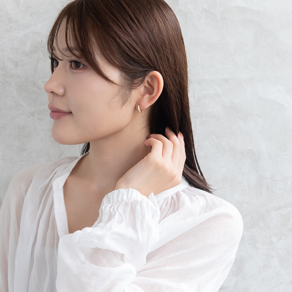er1090耳元にそっと寄り添う、キュービックジルコニアのイヤリングです。華奢なきらめきを邪魔しないよう、金具を小さく目立たなくしました。まるでピアスをつけているかのような、軽やかなつけ心地です。普段使いから特別な日まで、あなたの毎日をそっと彩るアイテムです。