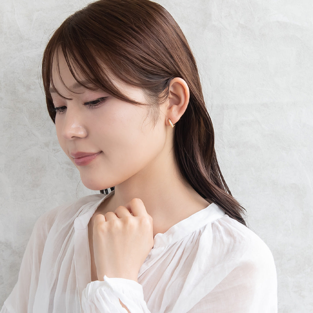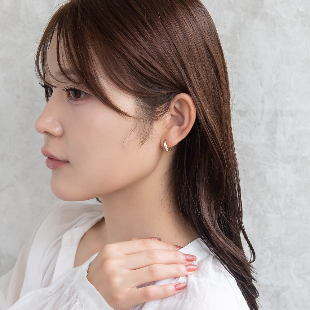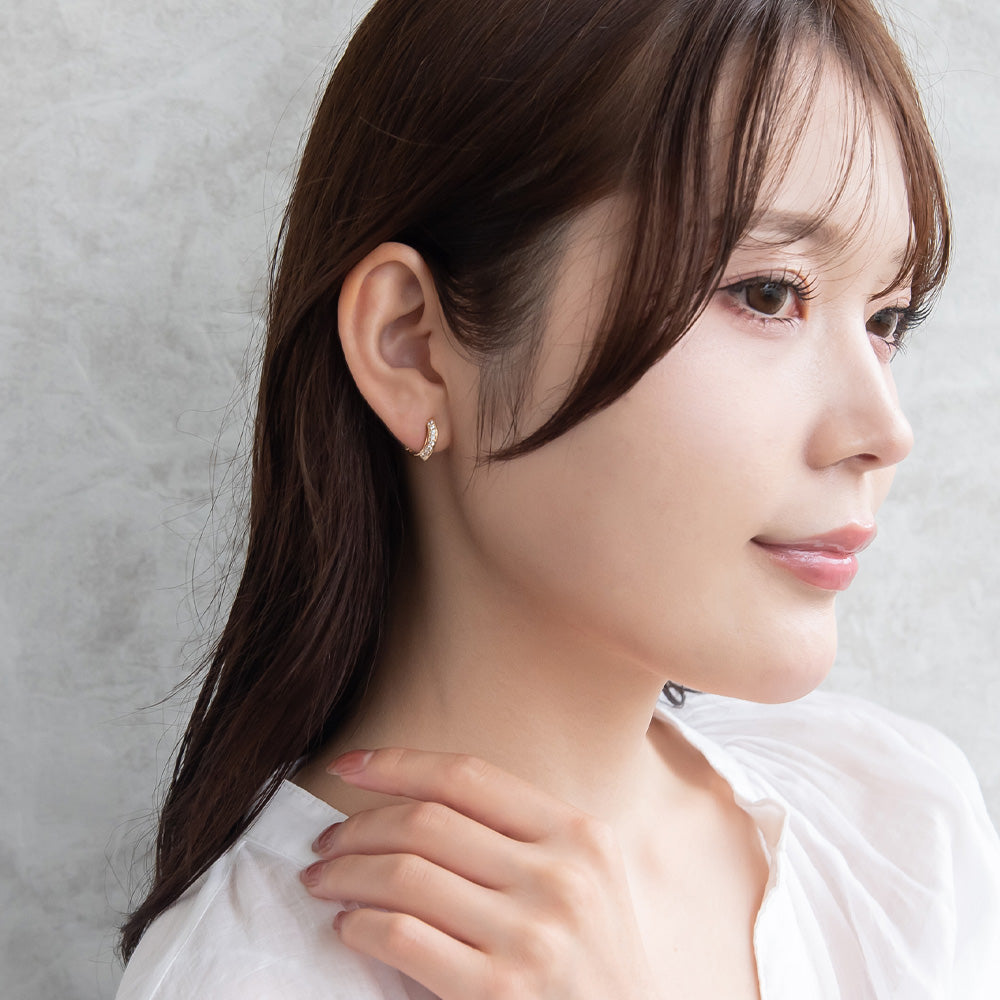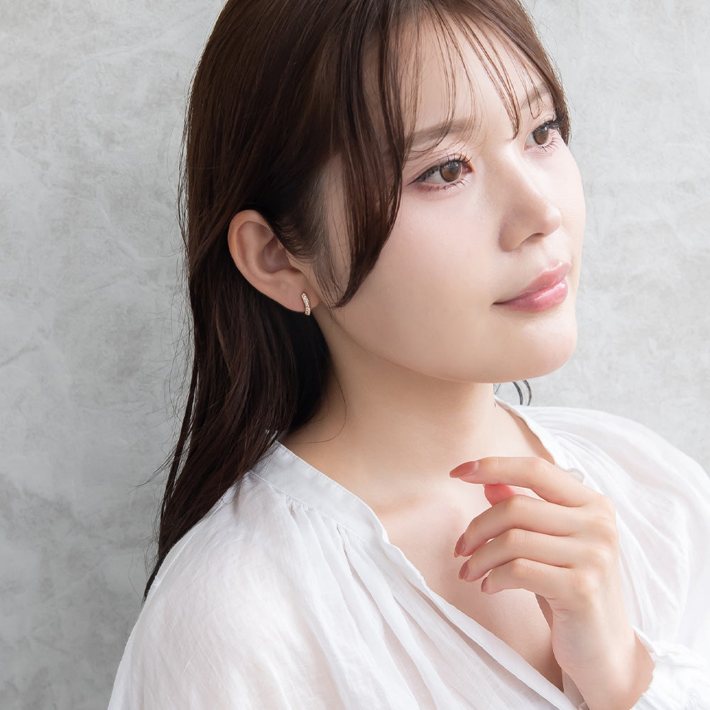 er1090耳元にそっと寄り添う、キュービックジルコニアのイヤリングです。華奢なきらめきを邪魔しないよう、金具を小さく目立たなくしました。まるでピアスをつけているかのような、軽やかなつけ心地です。普段使いから特別な日まで、あなたの毎日をそっと彩るアイテムです。