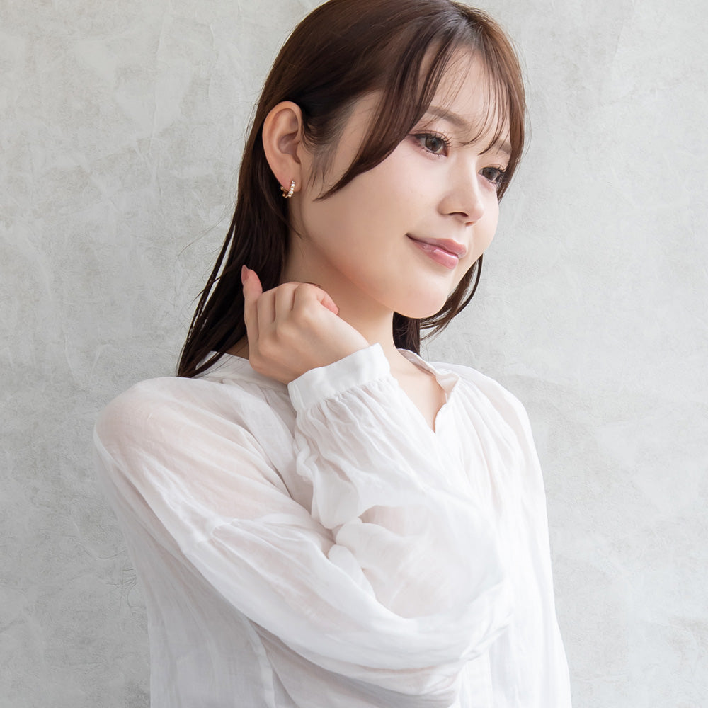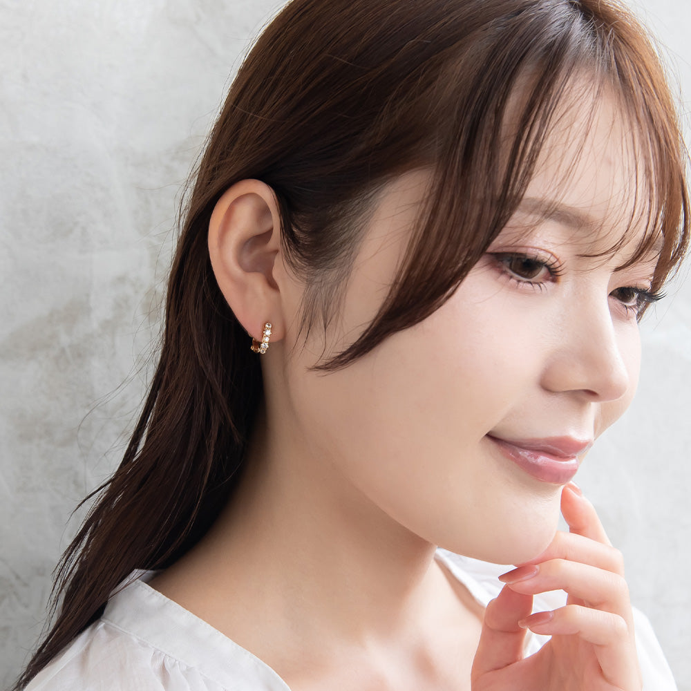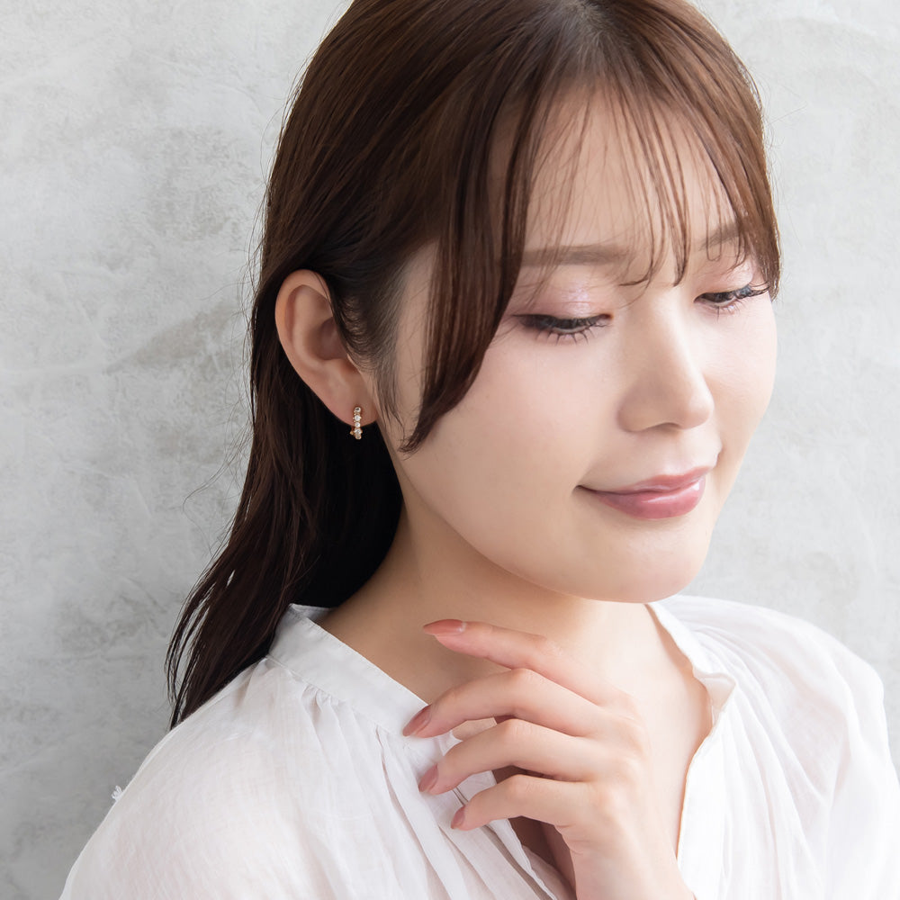 er1091耳元にそっと寄り添う、キュービックジルコニアのイヤリングです。華奢なきらめきを邪魔しないよう、金具を小さく目立たなくしました。まるでピアスをつけているかのような、軽やかなつけ心地です。普段使いから特別な日まで、あなたの毎日をそっと彩るアイテムです。