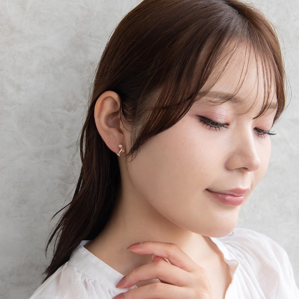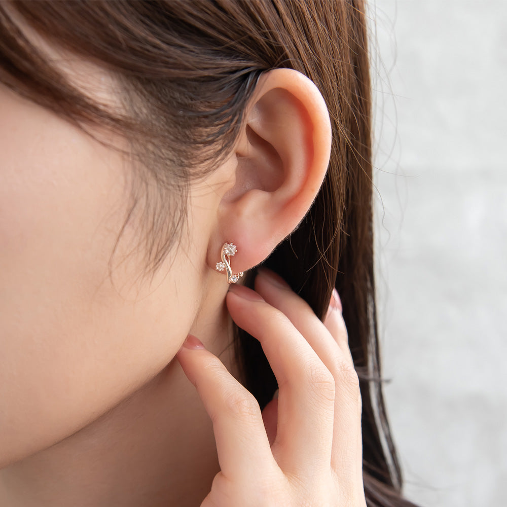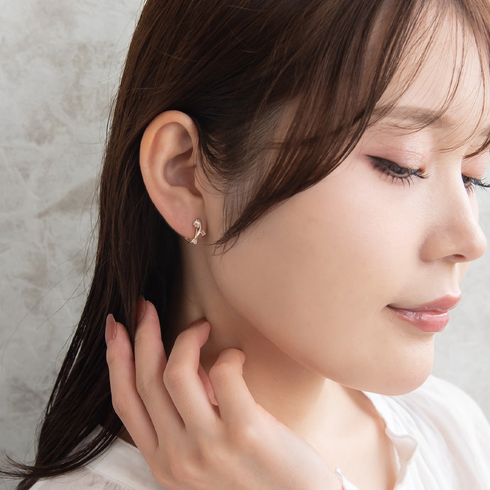 er1093耳元にそっと寄り添う、キュービックジルコニアのイヤリングです。華奢なきらめきを邪魔しないよう、金具を小さく目立たなくしました。まるでピアスをつけているかのような、軽やかなつけ心地です。普段使いから特別な日まで、あなたの毎日をそっと彩るアイテムです。
