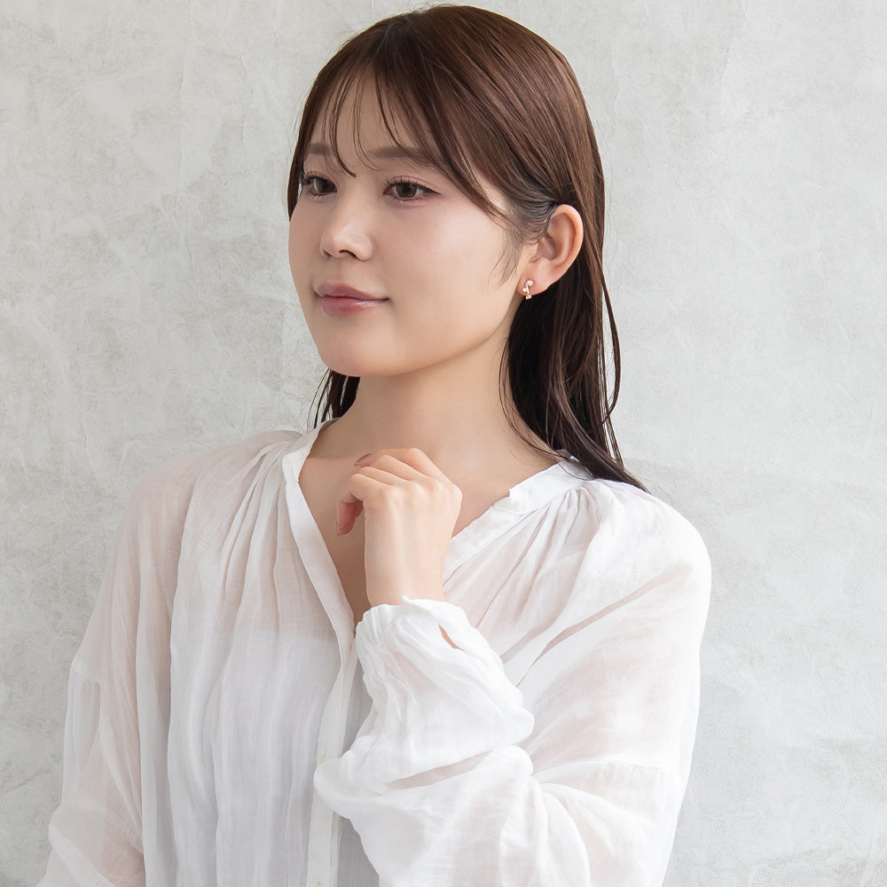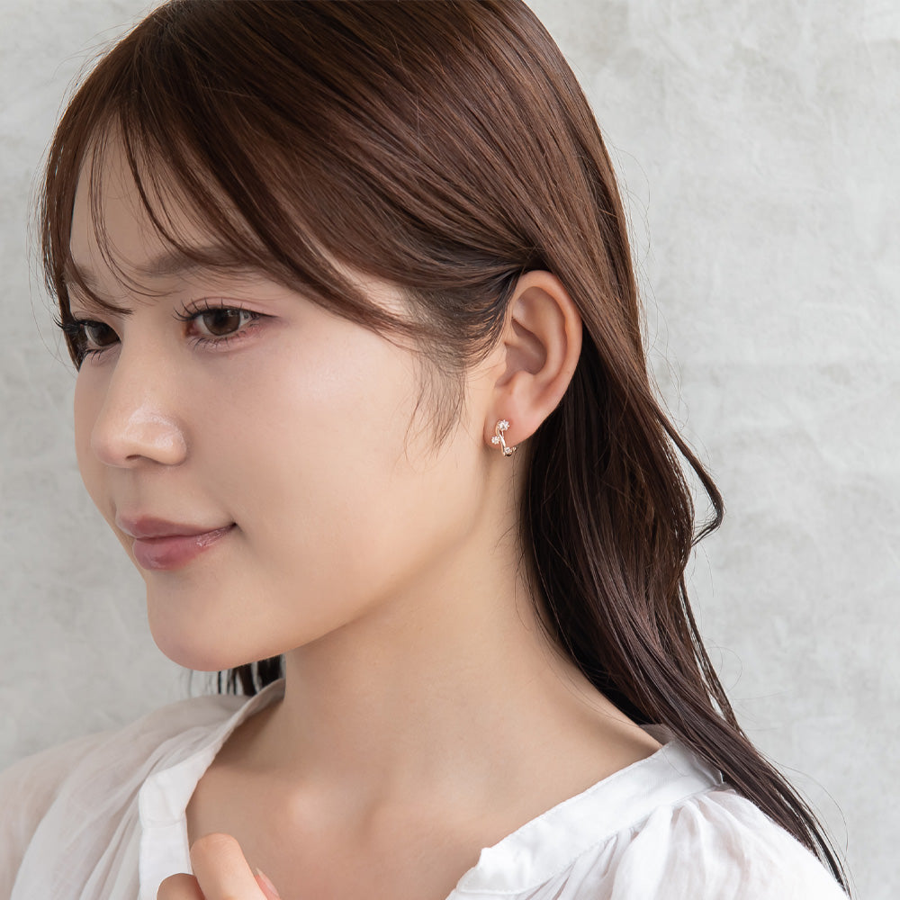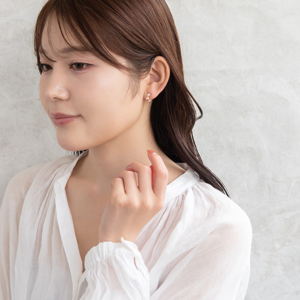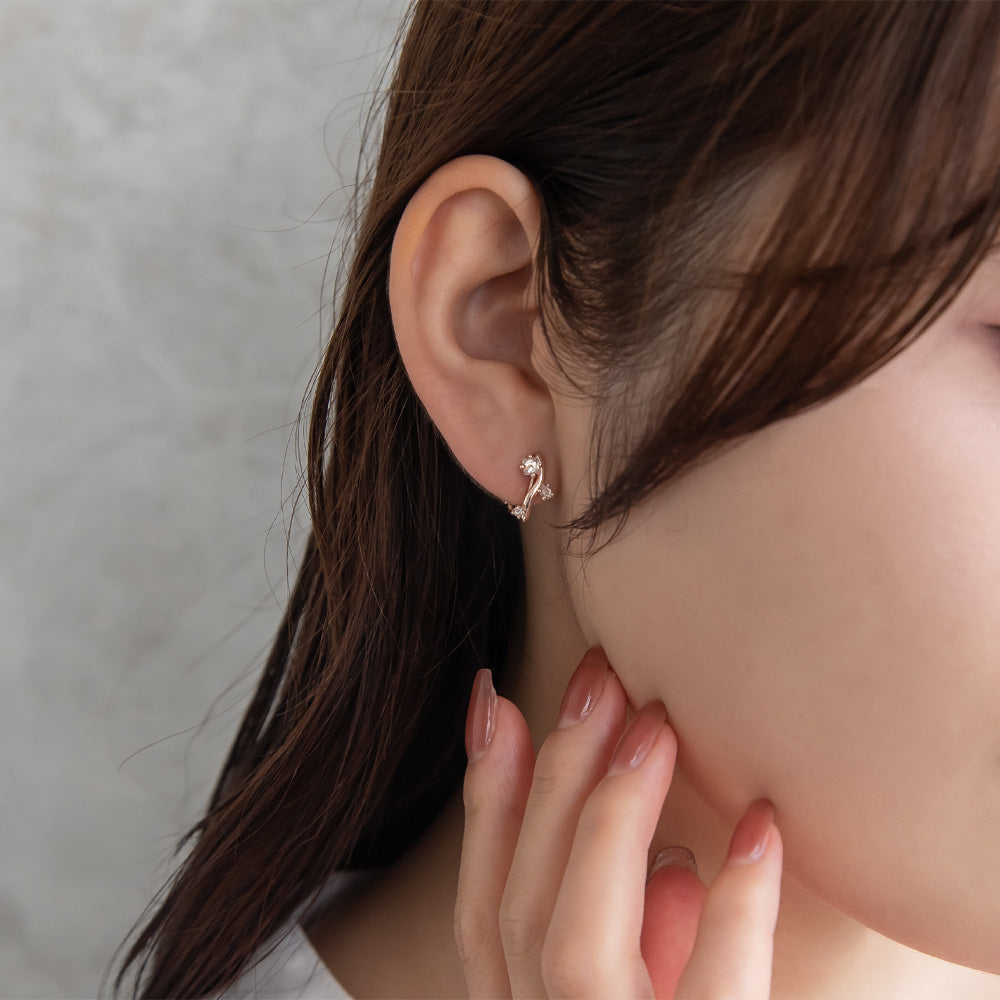 er1093耳元にそっと寄り添う、キュービックジルコニアのイヤリングです。華奢なきらめきを邪魔しないよう、金具を小さく目立たなくしました。まるでピアスをつけているかのような、軽やかなつけ心地です。普段使いから特別な日まで、あなたの毎日をそっと彩るアイテムです。