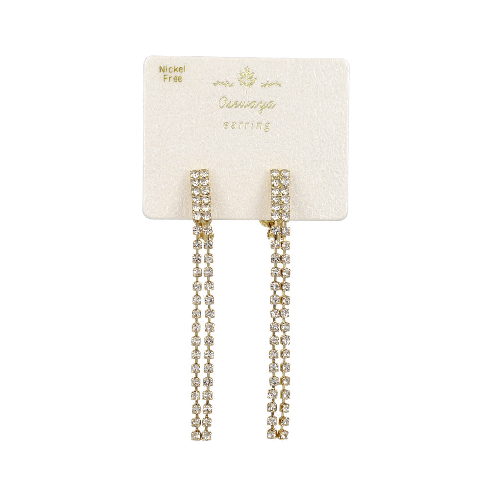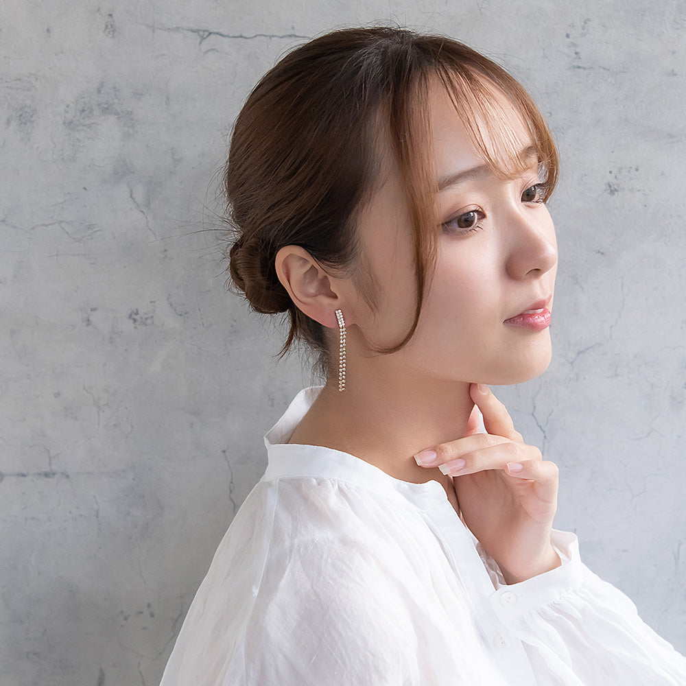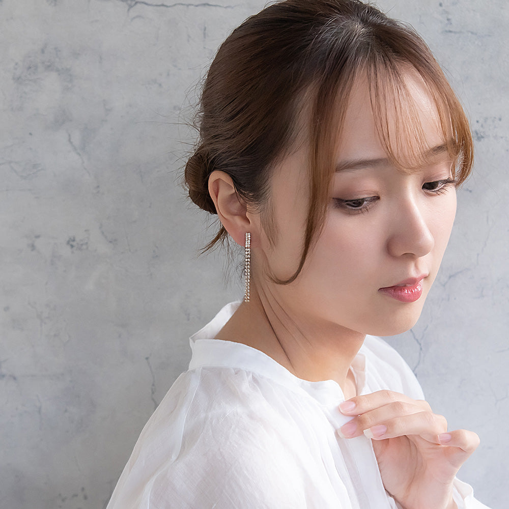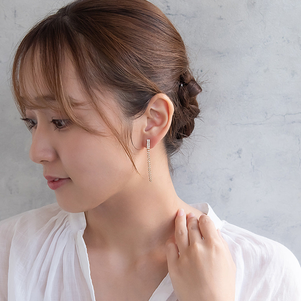 er1104さりげなく上品に、きらりと輝くラインストーンのイヤリング。目立ちにくくスッキリとした、お肌に優しい華奢な金具を使用したイヤリングです。