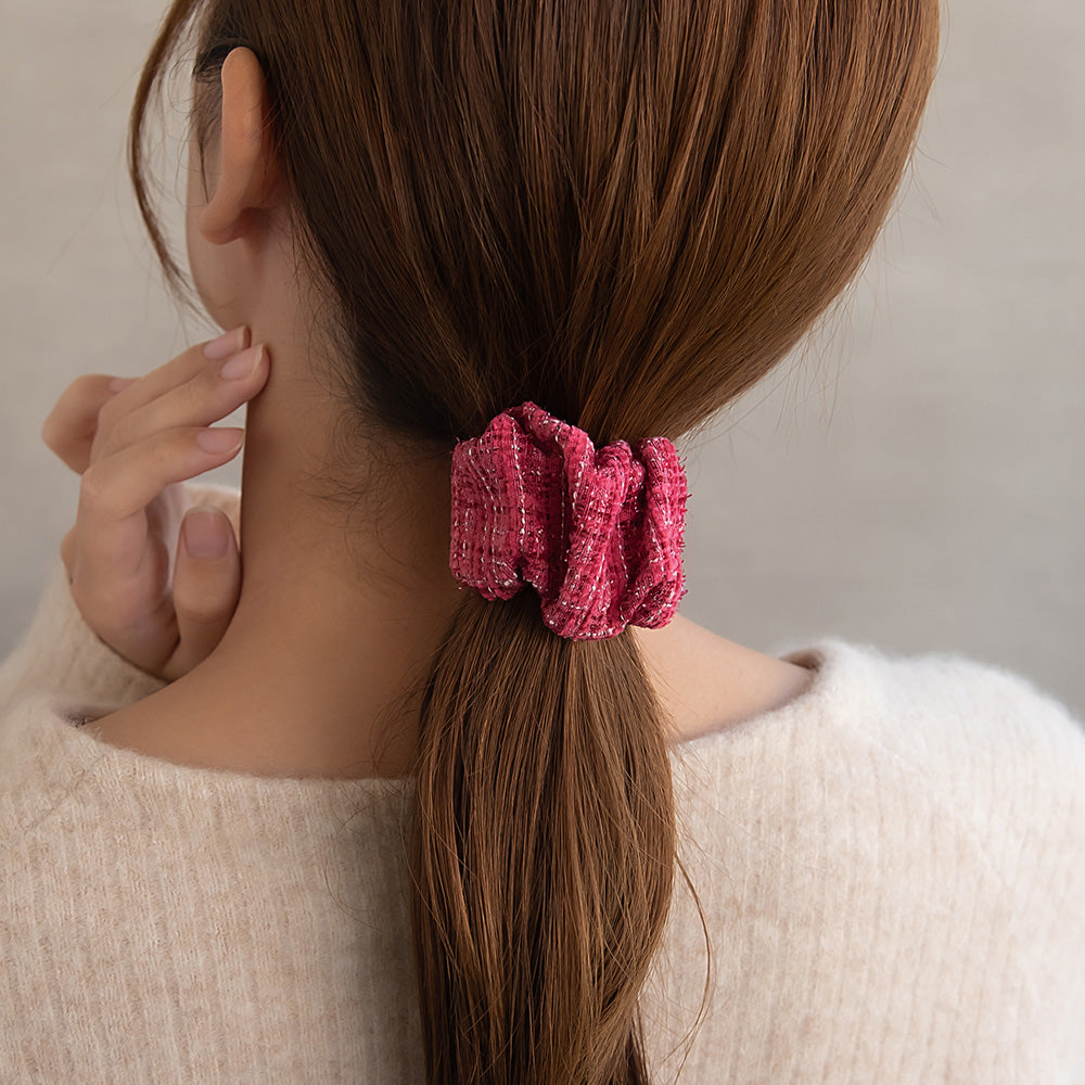 大人の品の良さが漂うツイード風素材。シュシュのように見えるクラップカフ。プラスワンで可愛さもおしゃれ度もアップ。季節感じる温かみある素材感も◎差し色使いにも◎