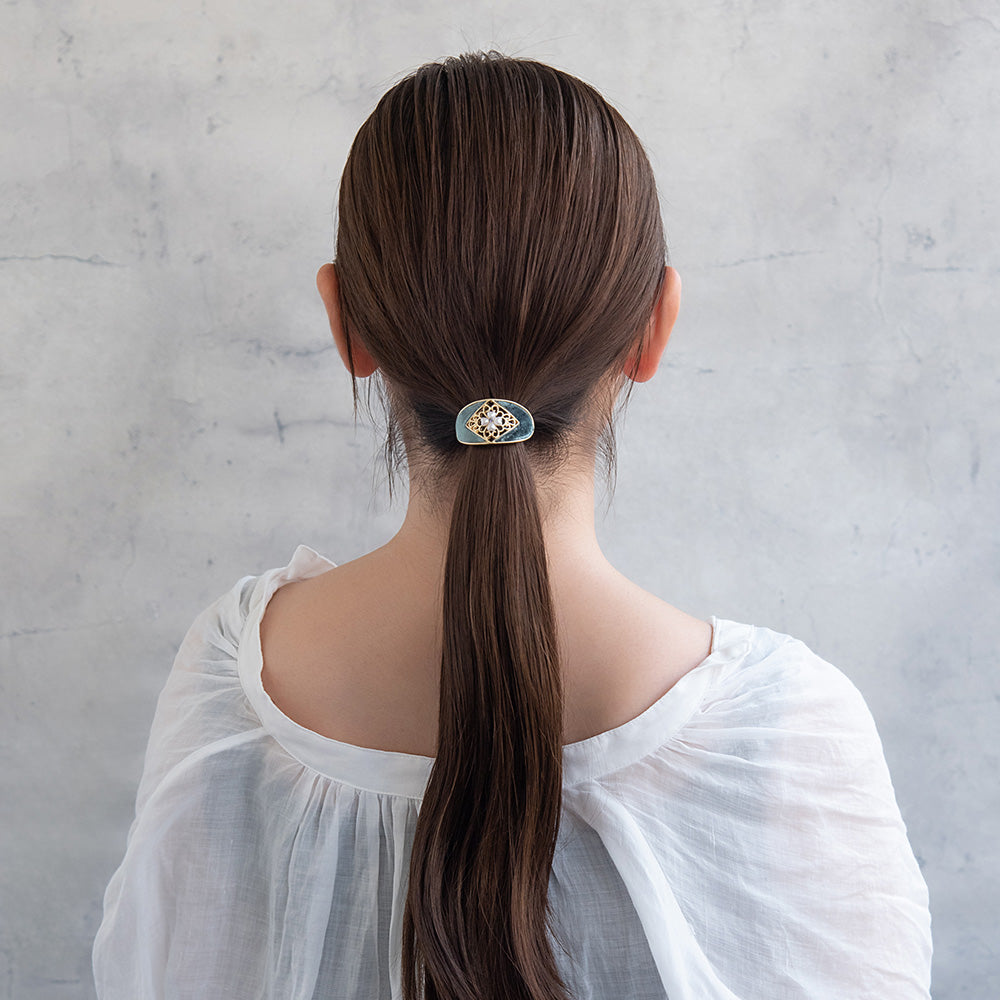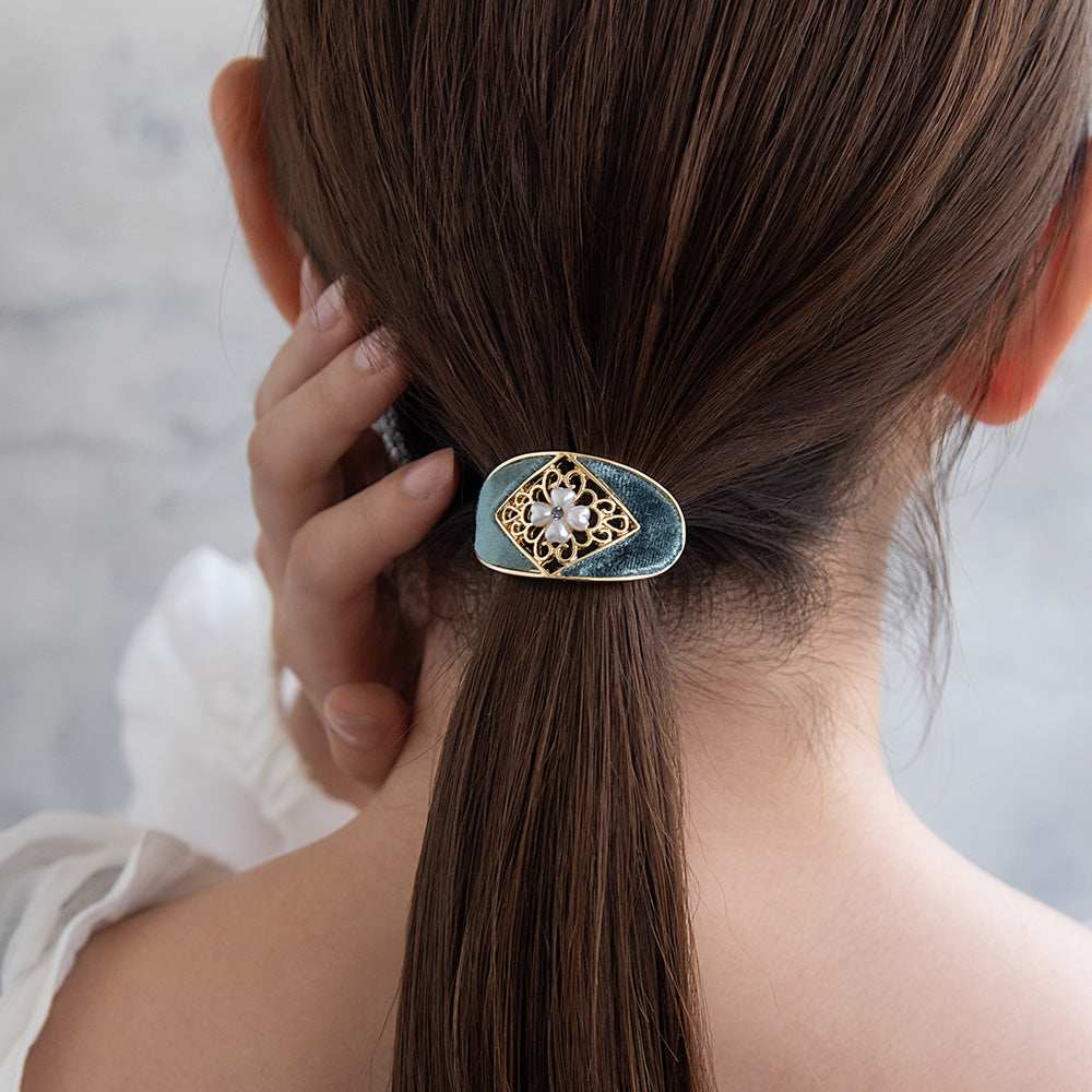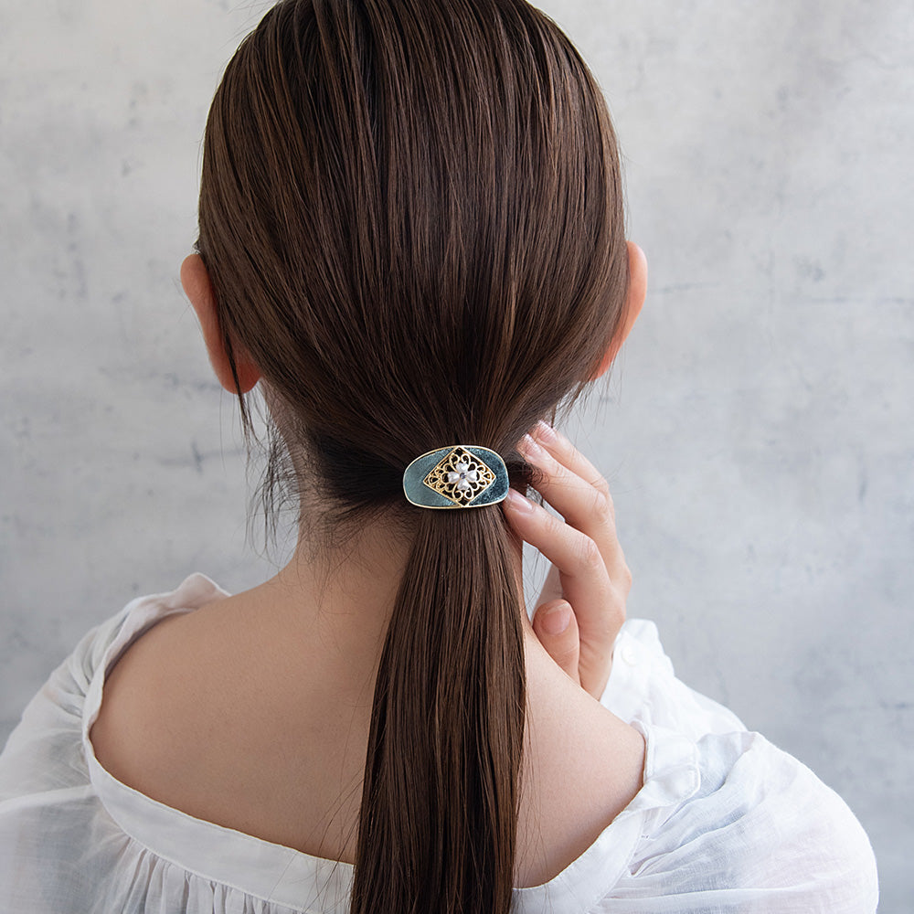 メタルとベロア、パールの光沢が綺麗な派手すぎない気品あるカラーリングのヘアカフ。