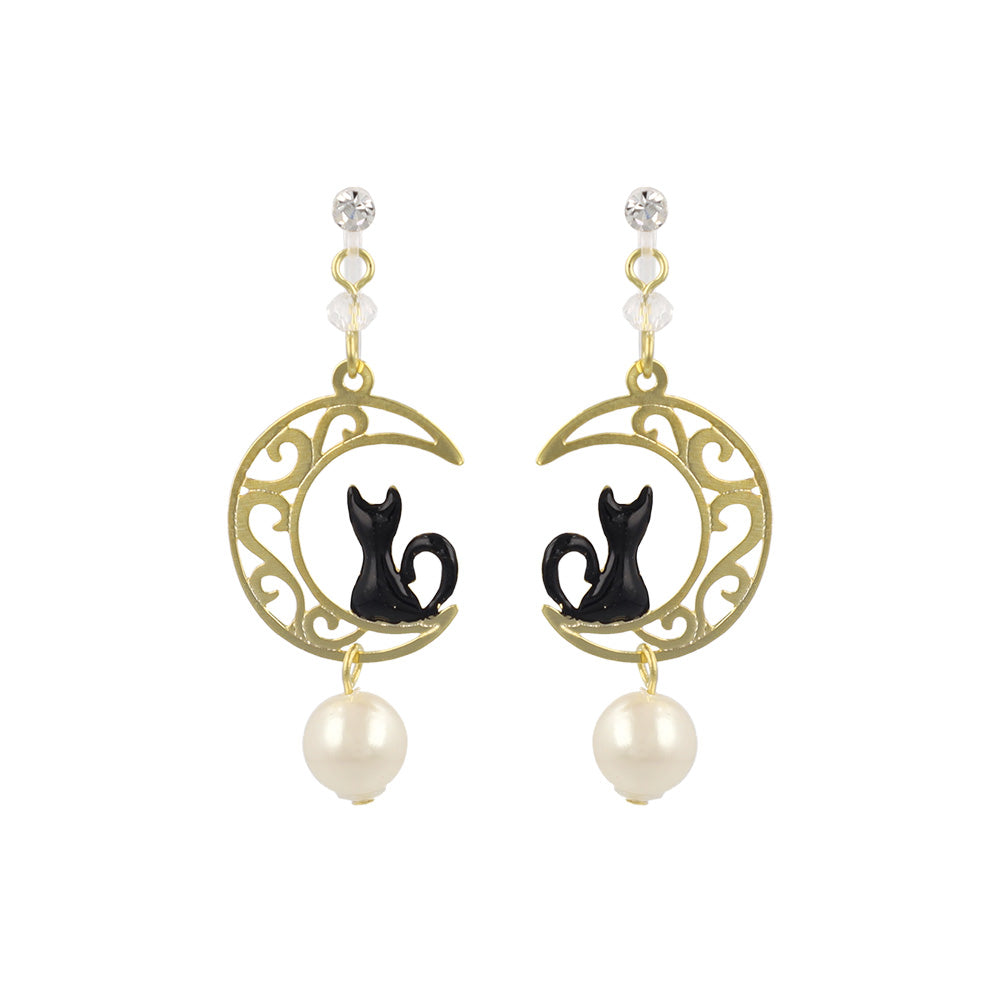 ノンホールピアス ニッケルフリー ネコと月 イヤリング 樹脂タイプ