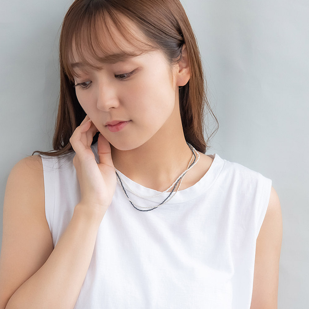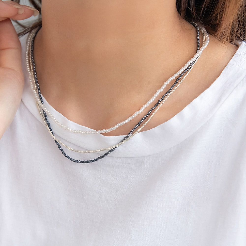 nk1141ビーズとパールの3連風ネックレス。季節を問わないシンプルなデザインで様々なコーディネートに合わせやすいアイテムです。