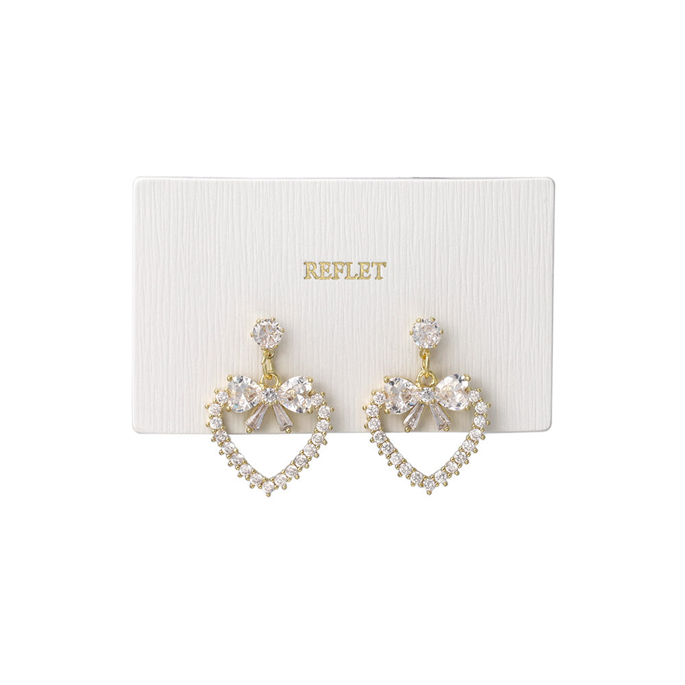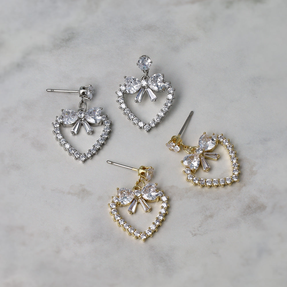 きらりと美しく輝く、キュービックジルコニアのピアス。とことん甘く、かわいく、乙女心くすぐるハートxリボンデザイン。小ぶりながら存在感もあってコーデ映え。
