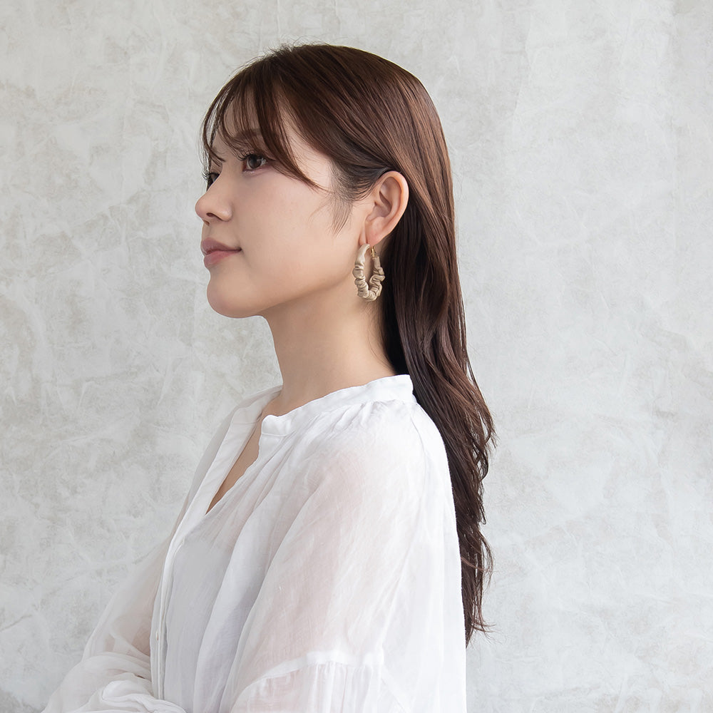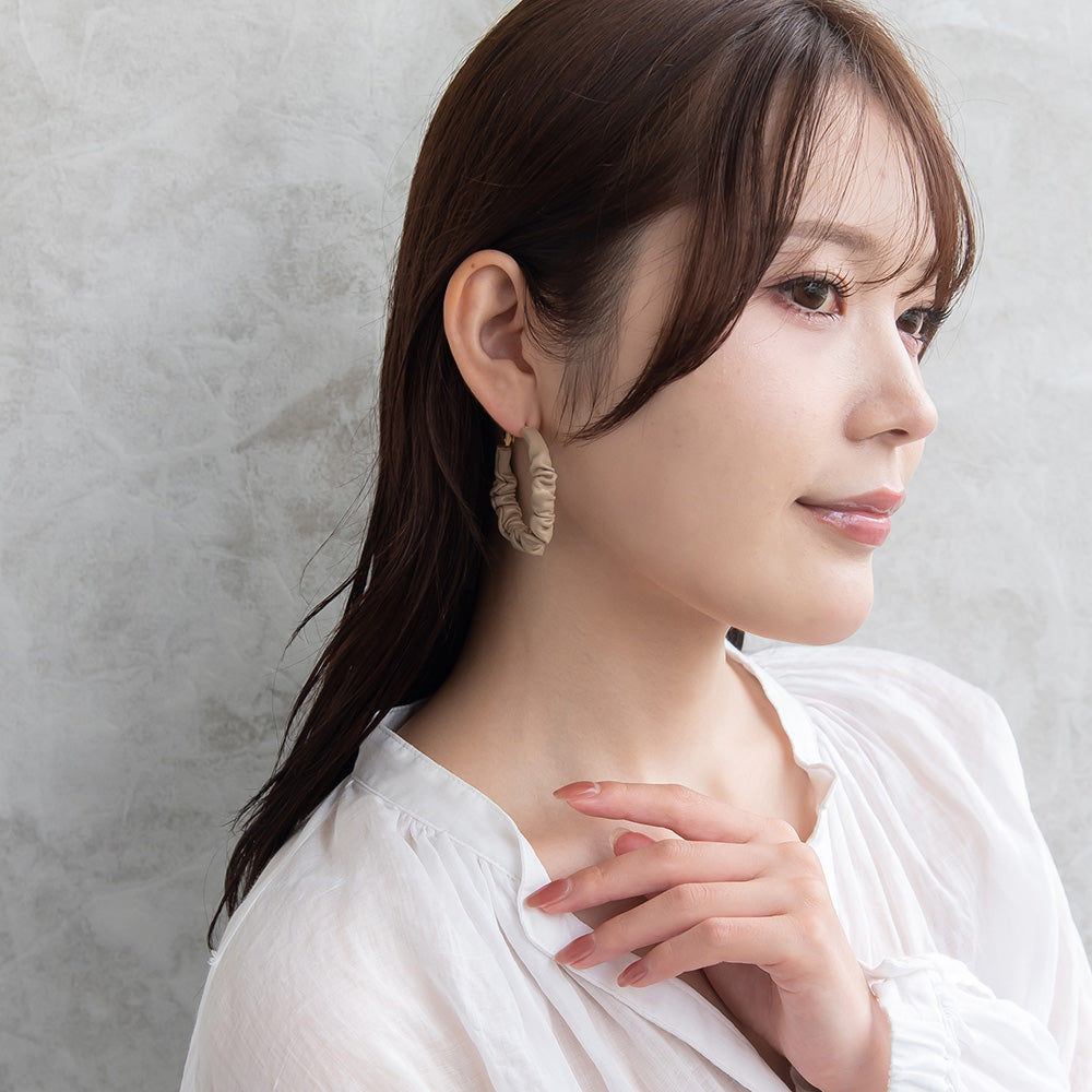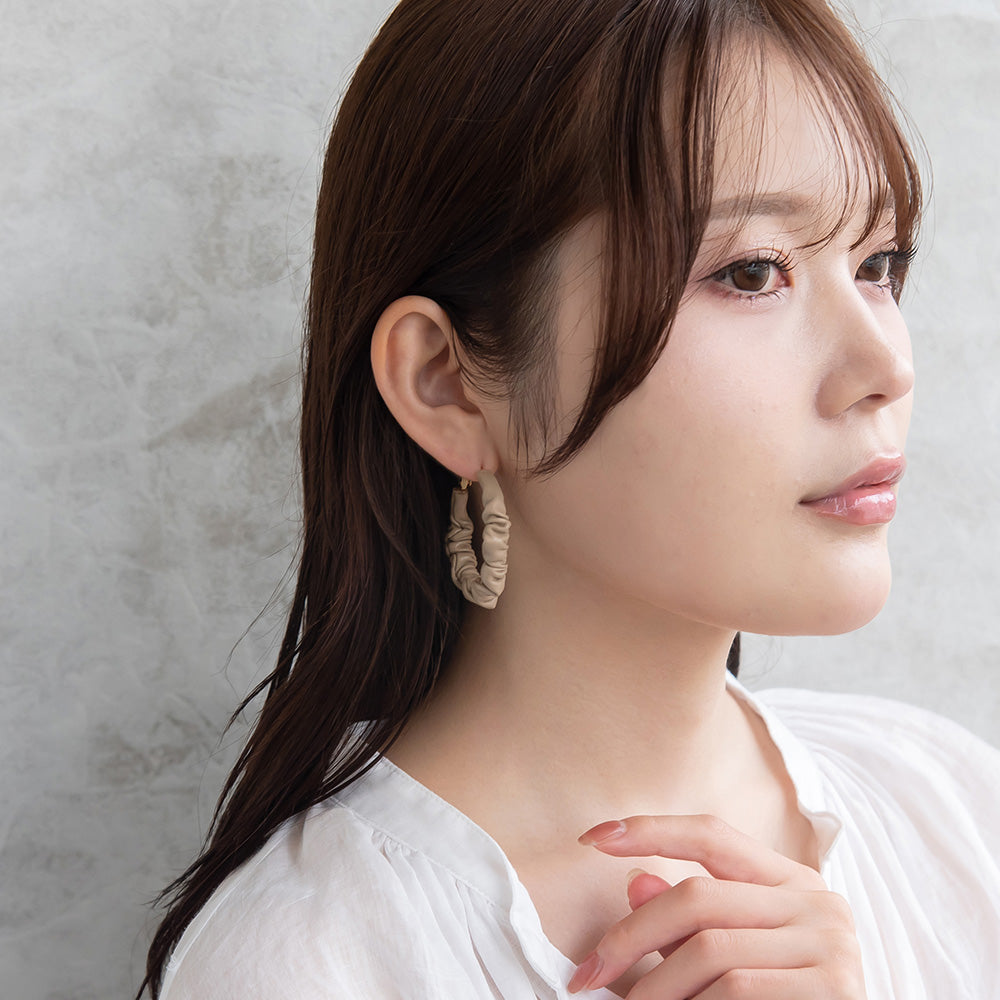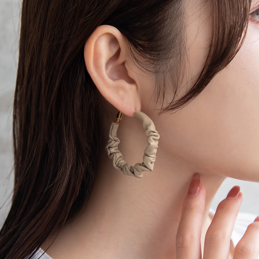 pc2092ひとクセあり、フェイクレザーのフープピアス。くしゅくしゅっとした、ギャザー感が可愛く魅力的。プラスワンでおしゃれ度UPなアイテム。