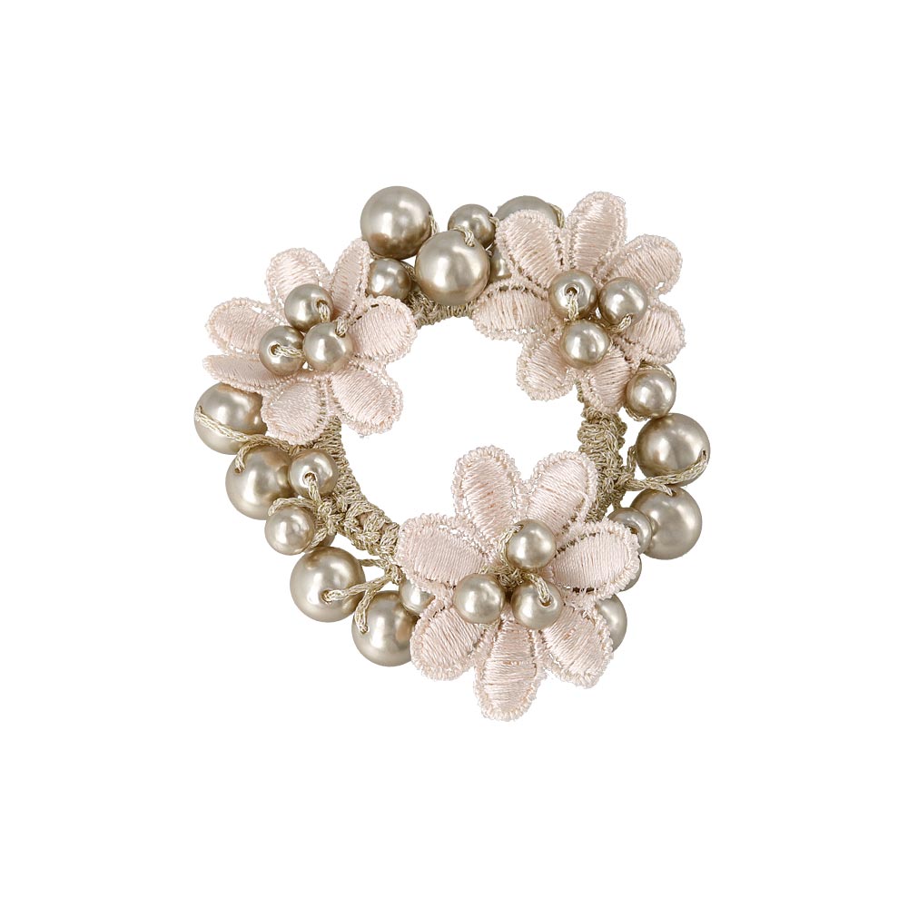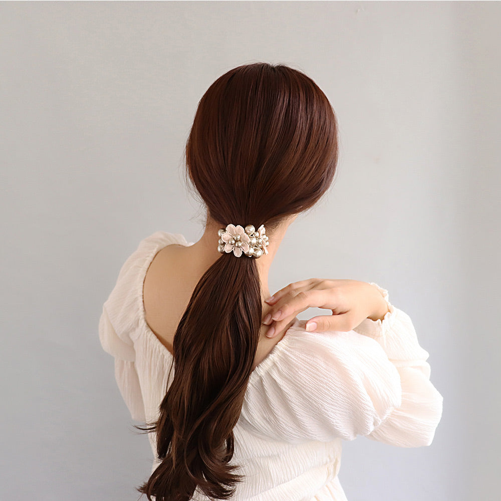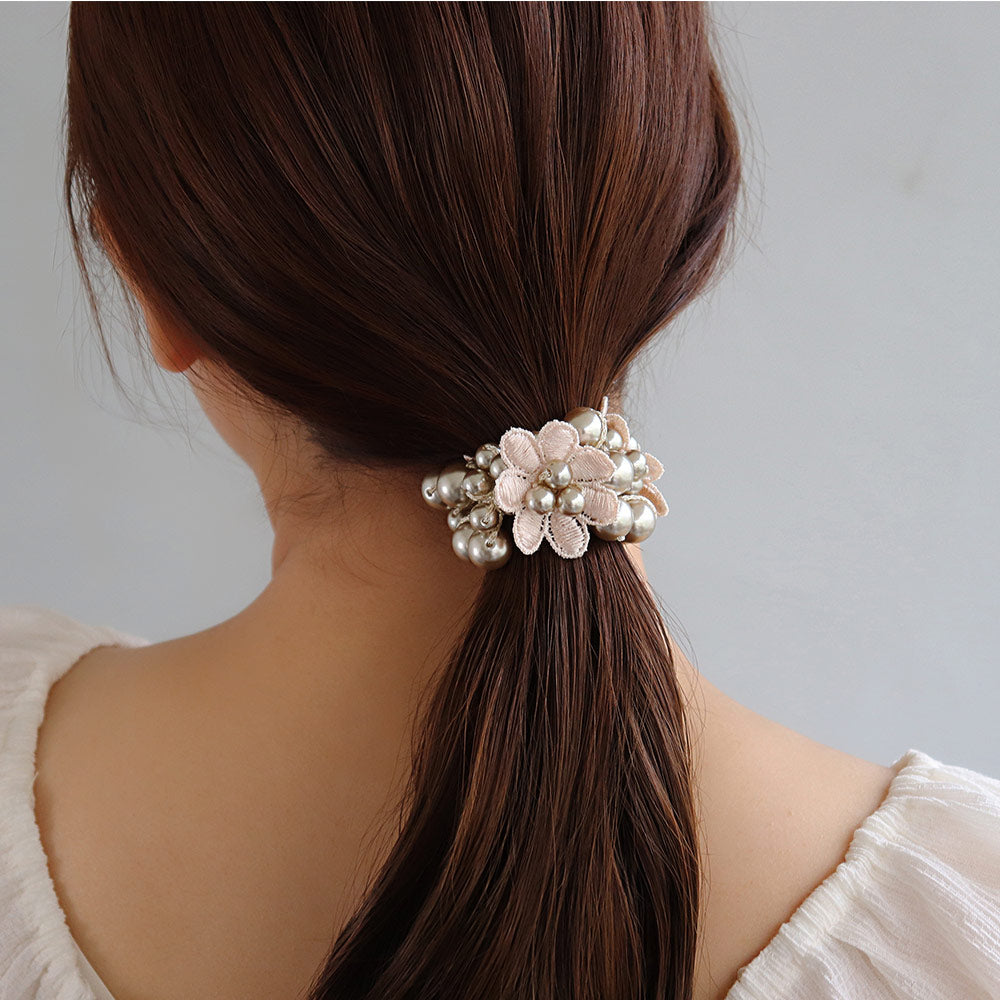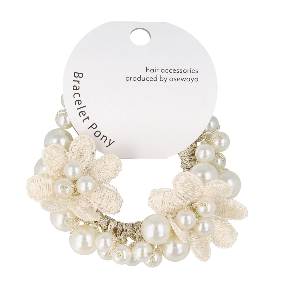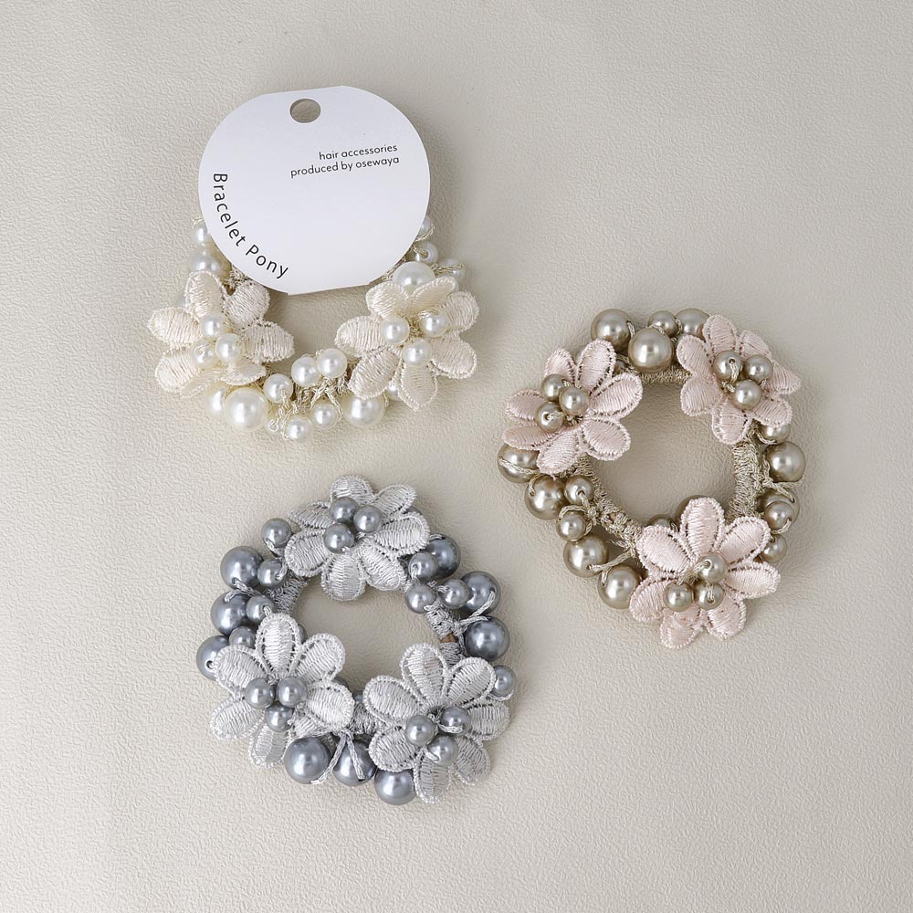 pn0671テクニックいらずの着けるだけで即おしゃれ見え。落ち着きあるキレイ色のカラーパールにお花をあしらった華やかでレディなデザイン。泡のようなパールがキレイなヘアポニーは、ブレスレットにしても可愛いアイテム。差し色使いにも◎