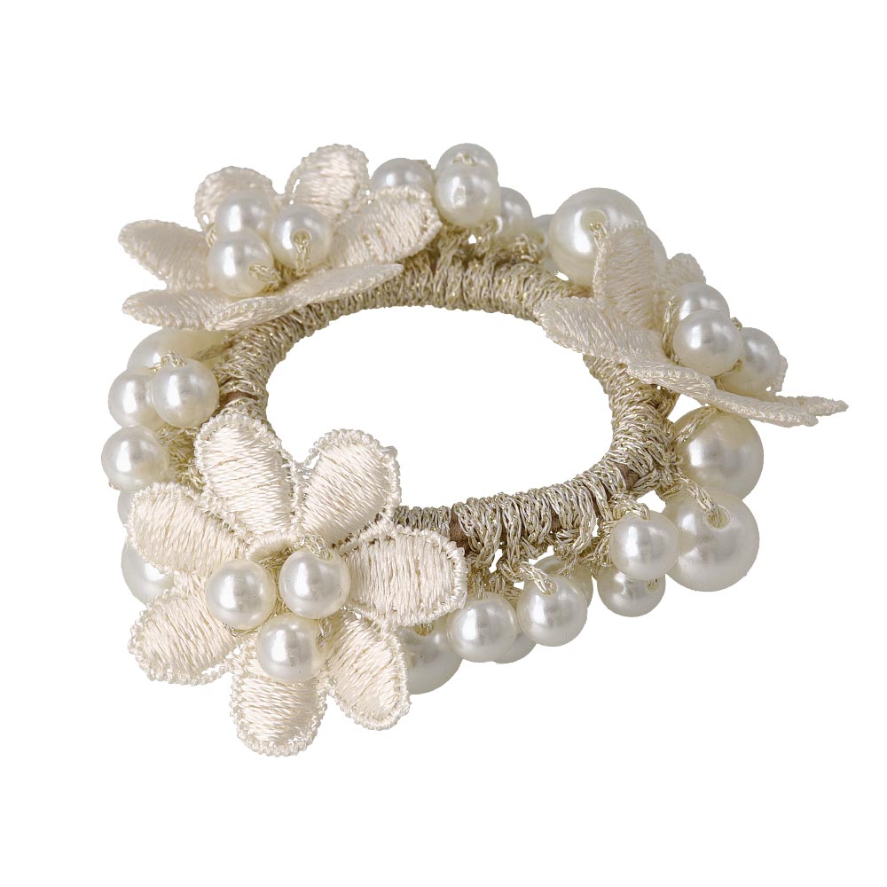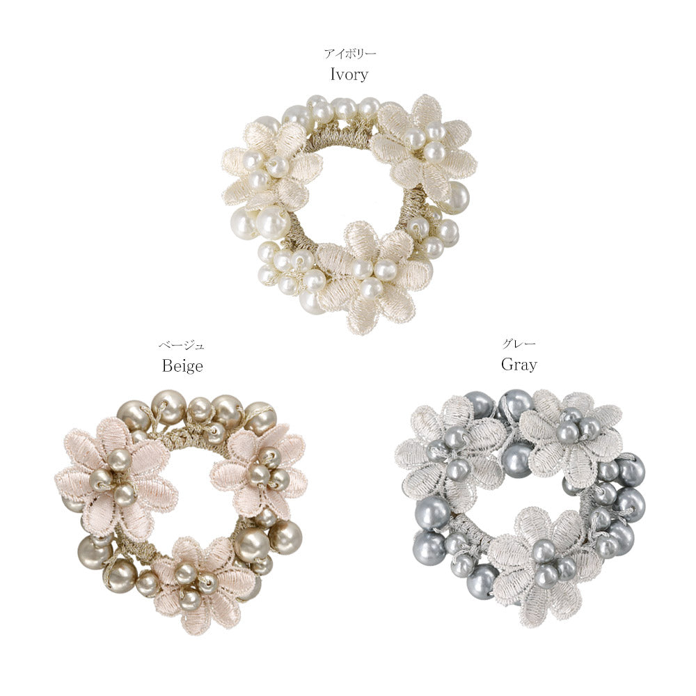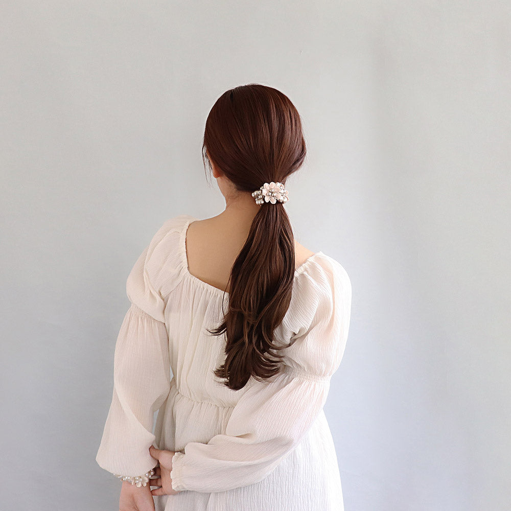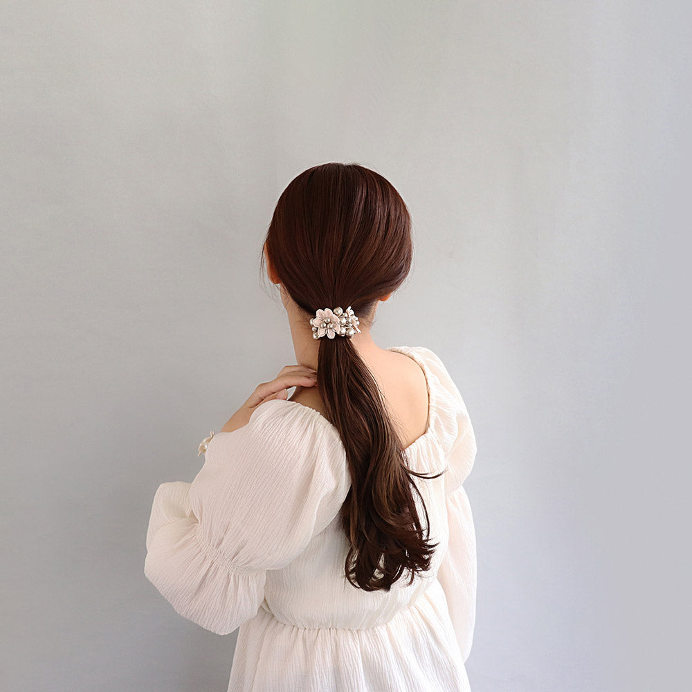 pn0671テクニックいらずの着けるだけで即おしゃれ見え。落ち着きあるキレイ色のカラーパールにお花をあしらった華やかでレディなデザイン。泡のようなパールがキレイなヘアポニーは、ブレスレットにしても可愛いアイテム。差し色使いにも◎