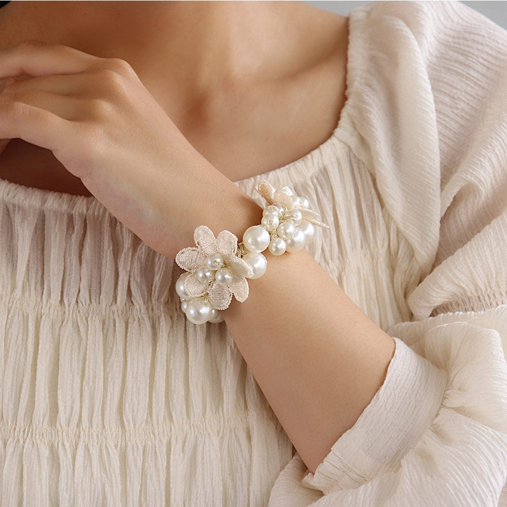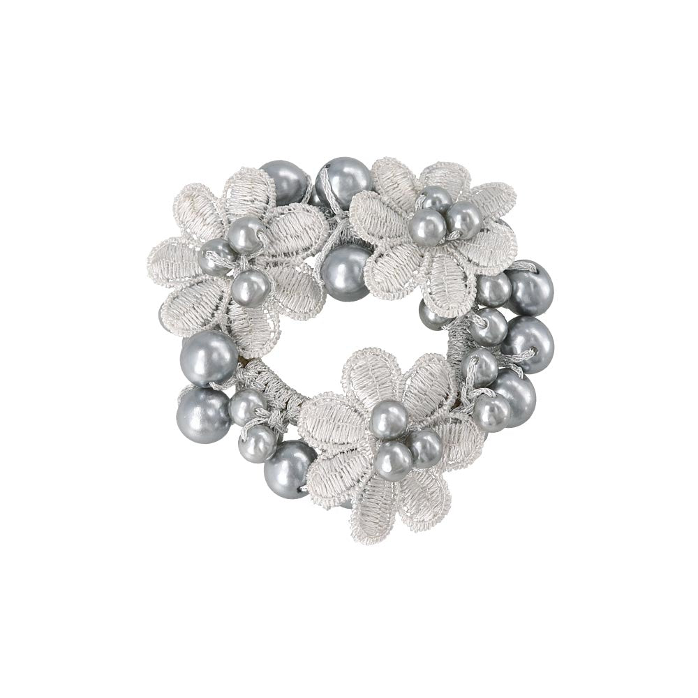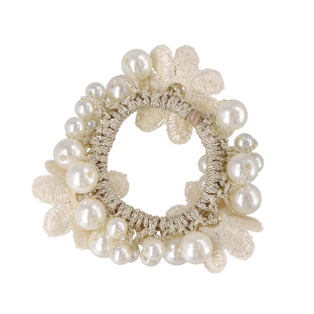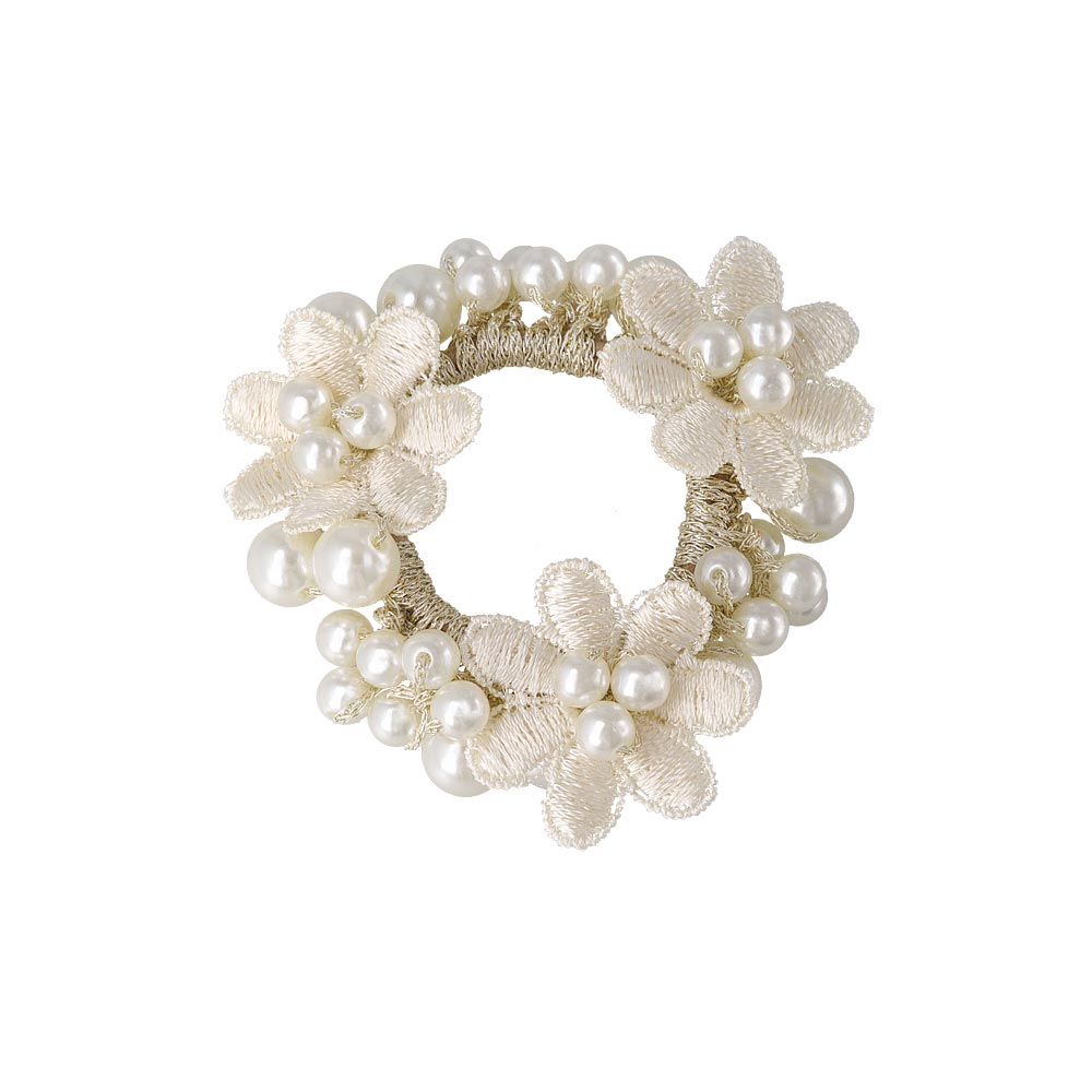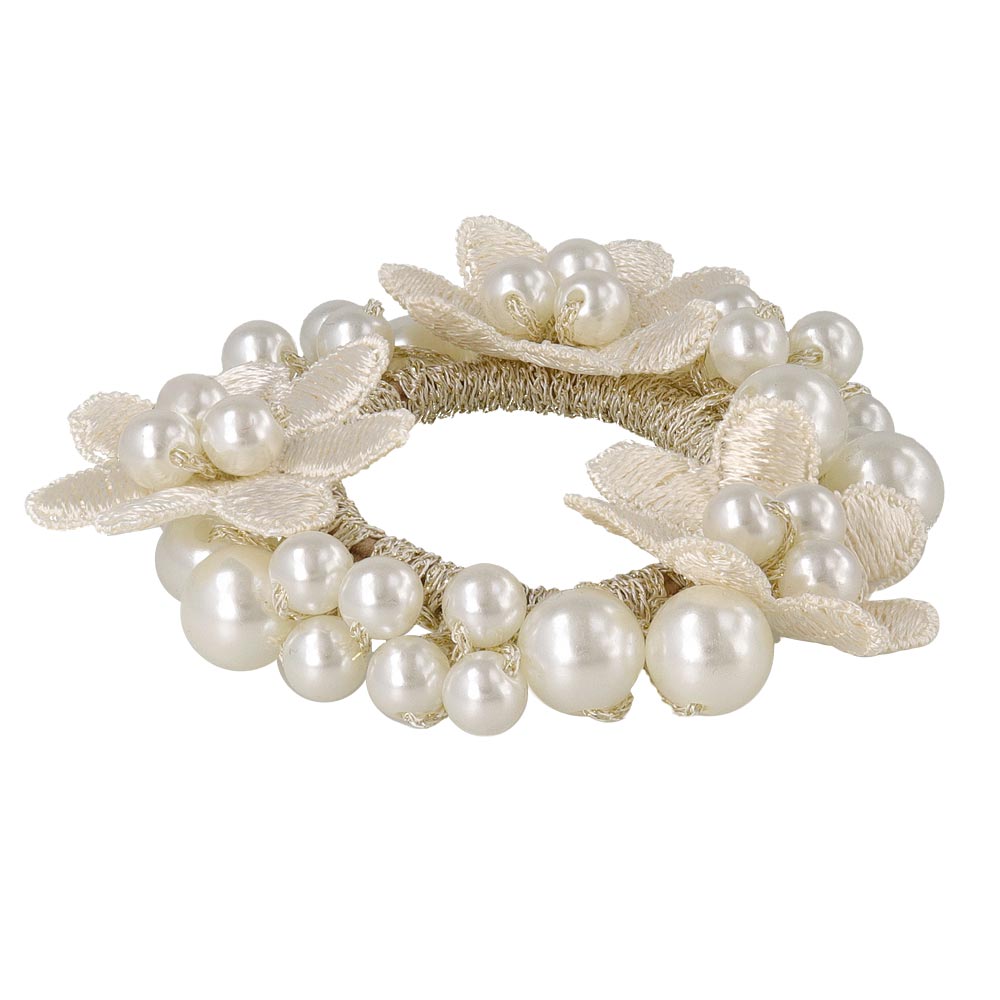 pn0671テクニックいらずの着けるだけで即おしゃれ見え。落ち着きあるキレイ色のカラーパールにお花をあしらった華やかでレディなデザイン。泡のようなパールがキレイなヘアポニーは、ブレスレットにしても可愛いアイテム。差し色使いにも◎