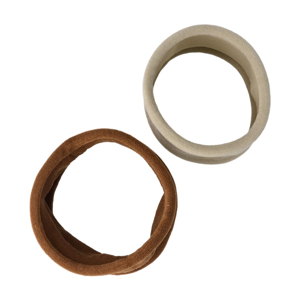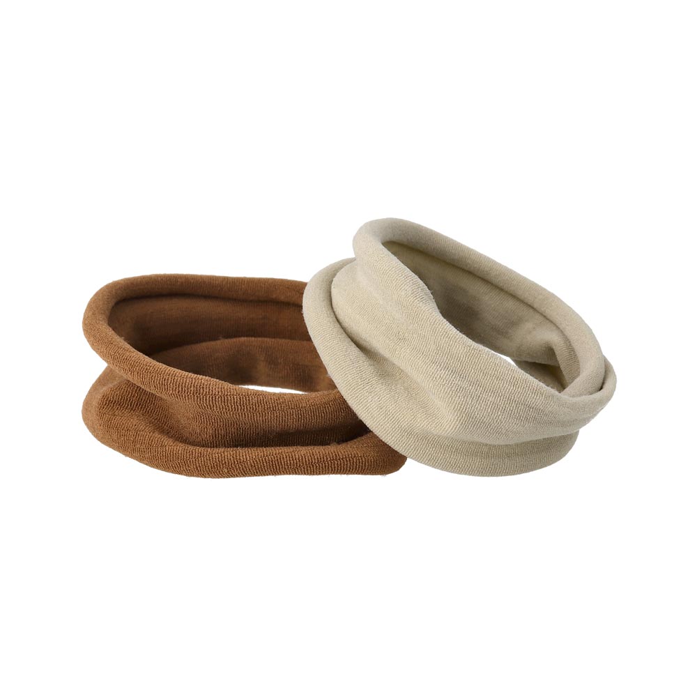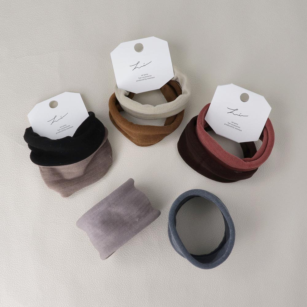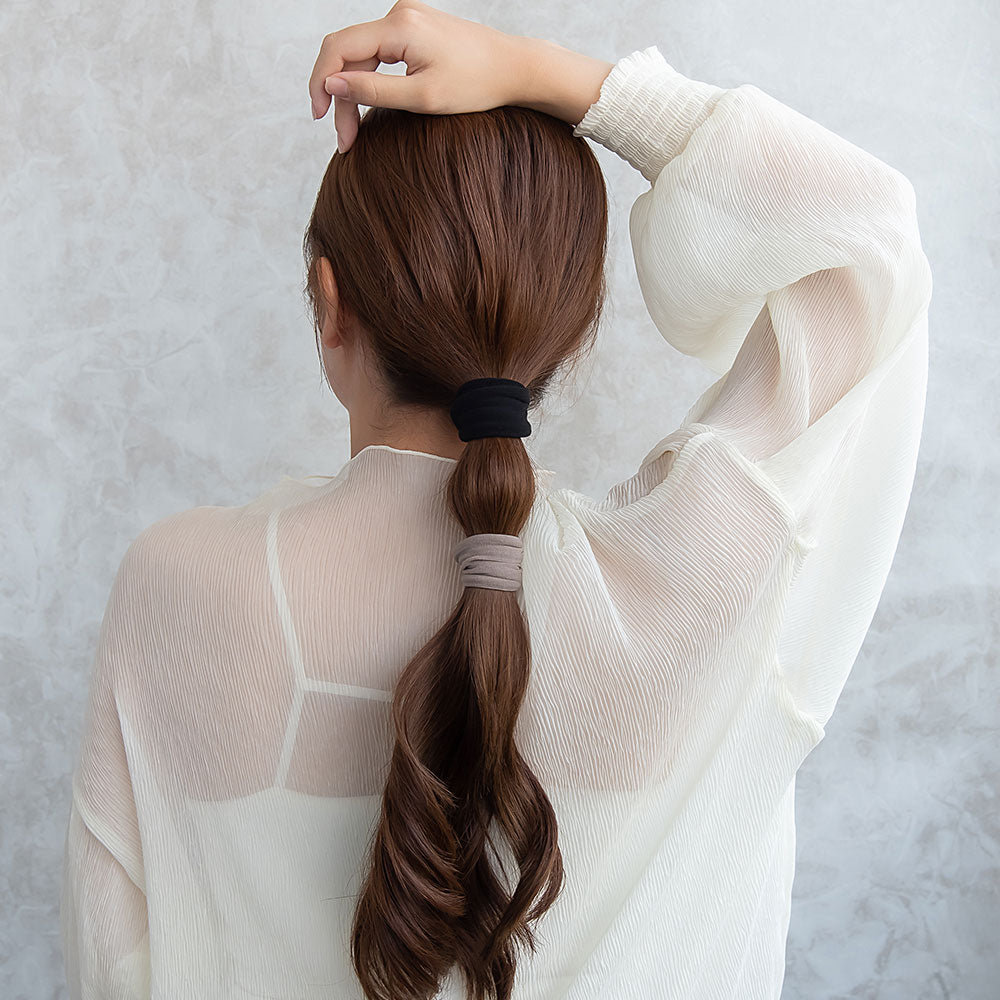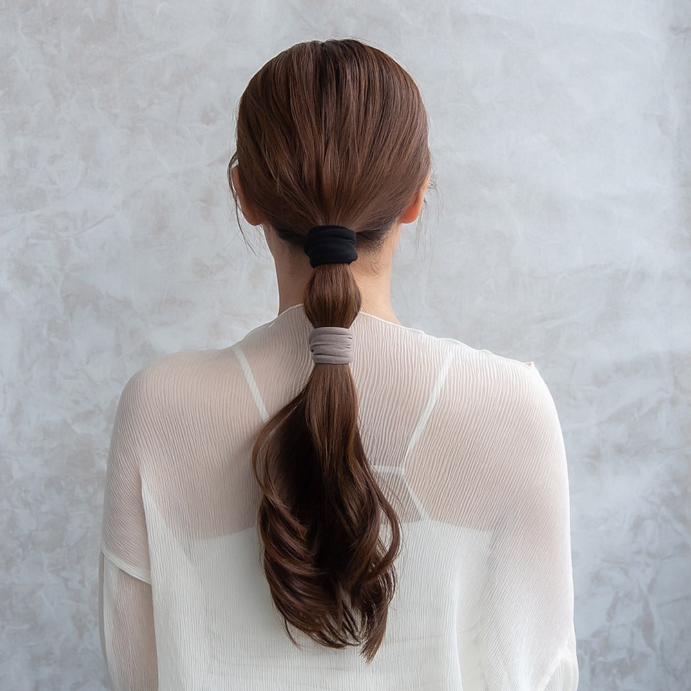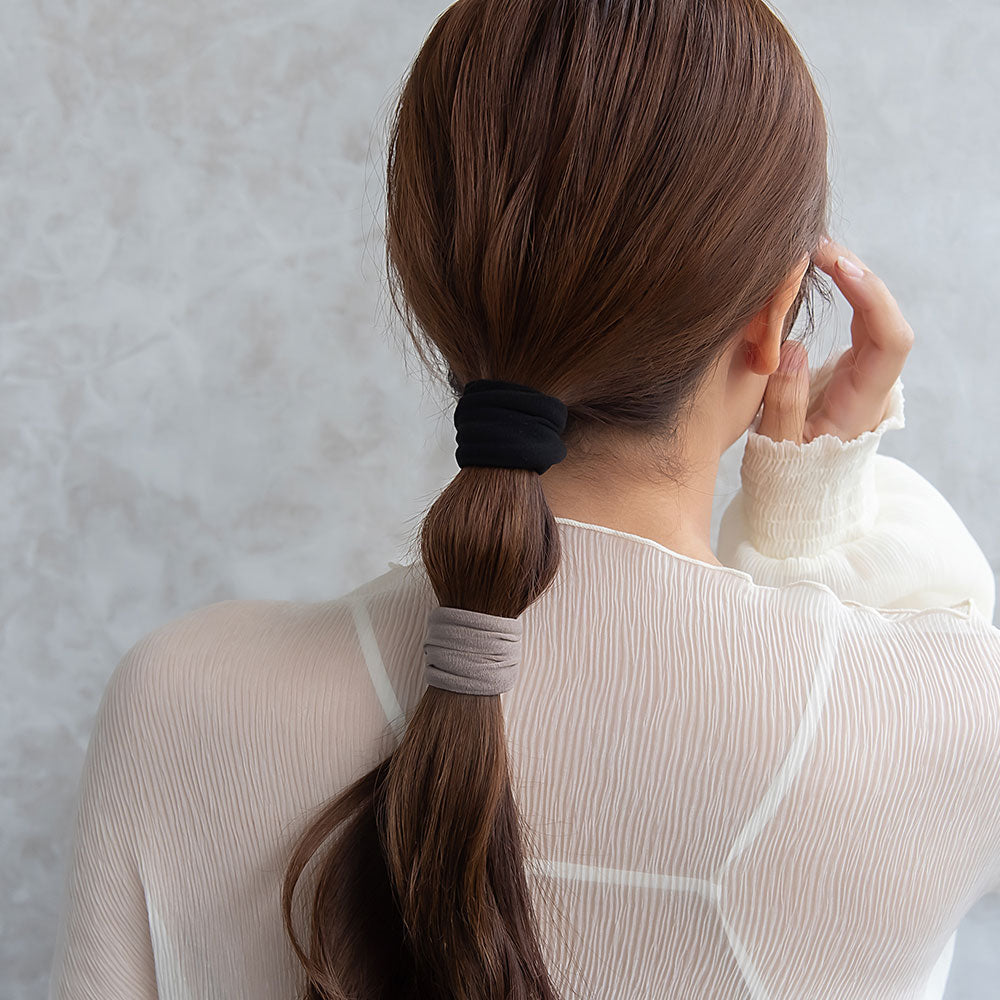 つなぎ目がなく、伸縮性のあるやわらか素材のヘアゴム。柔らかくて跡がつきにくい。アレンジの幅が広がるセットカラーの万能アイテム。単体でもセットでも使えるところも嬉しいポイント。お出かけにも、お家でも◎親子でお揃いや兼用も◎