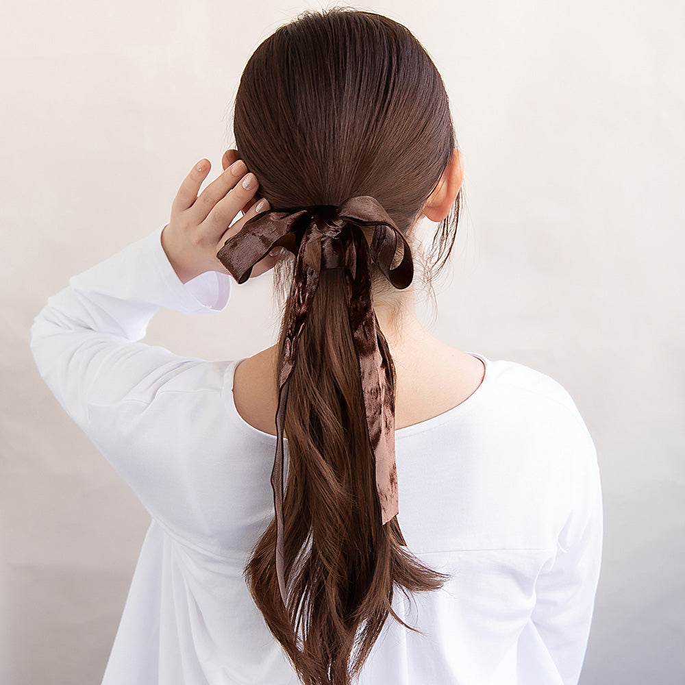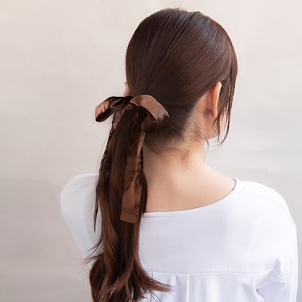 pn0723様々なアレンジが楽しめるブラウンカラーのベロアのリボンテープ。テイストを選ばないベーシックカラーで、カジュアルからフォーマルまで様々なコーディネートを楽しめます。リボン結びや編み込み、ぐるぐると髪に巻くだけでセルフで簡単にアレンジ可能。