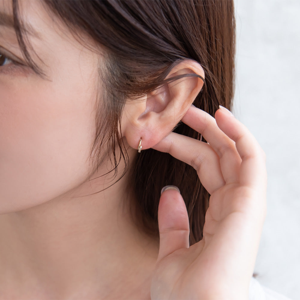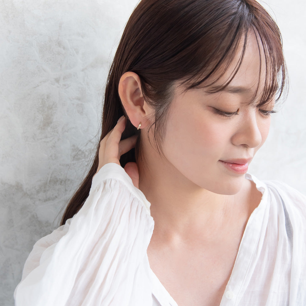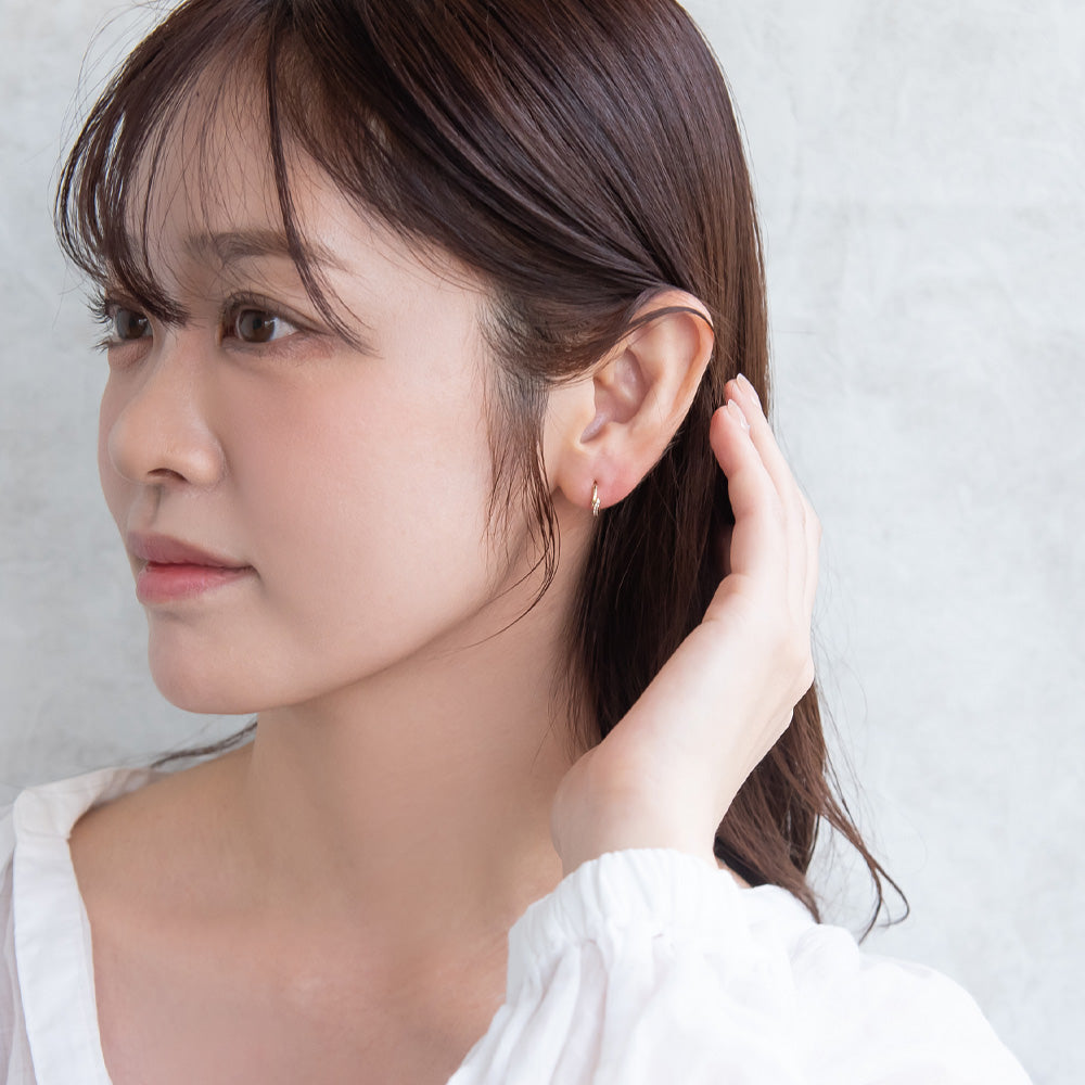 pp0757どんなスタイリングにも似合う上品なデザインのメタルのフープピアス。小ぶりではありながらも存在感があり、さりげないおしゃれを演出してくれるアイテムです。飽きの来ないデザインで、プレゼントにもおすすめ。キャッチ不要の便利なワンタッチピアス。