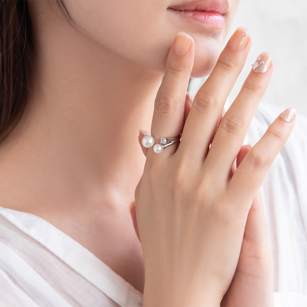 rg0638パールとキュービックジルコニアが上品に煌めくファッションリング。手元に華やかさを添える、高級感漂う美しいデザイン。