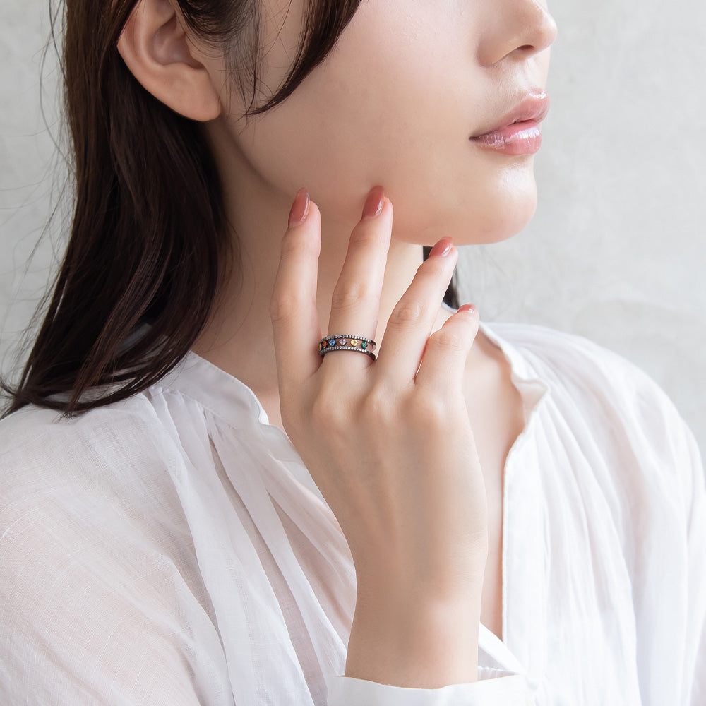 rg0644カラフルストーンがガンメタルに映えるデザインリング。