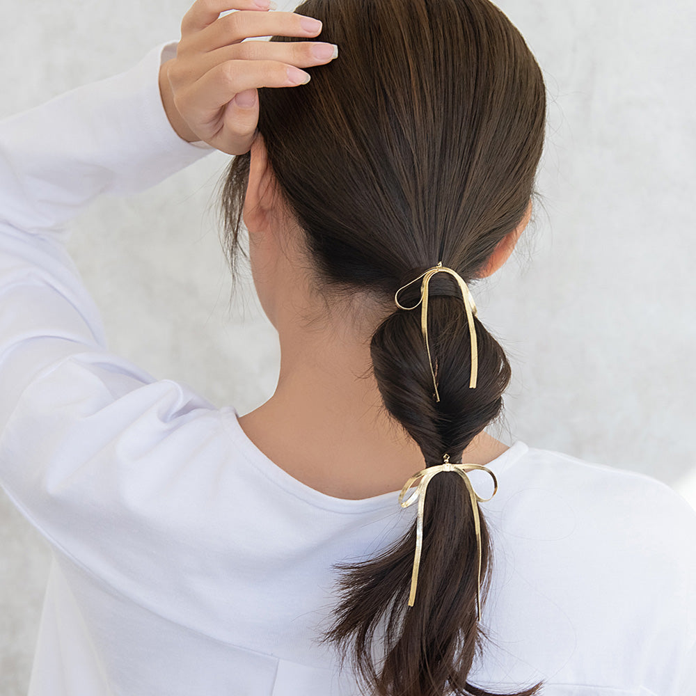ゆれるシルエットが愛らしいリボンのヘアピン。キラッと輝く、トレンドのリボンアイテムを大人コーデのポイント使いに。ほどよい甘さもプラス◎メタルカラーで使い勝手◎