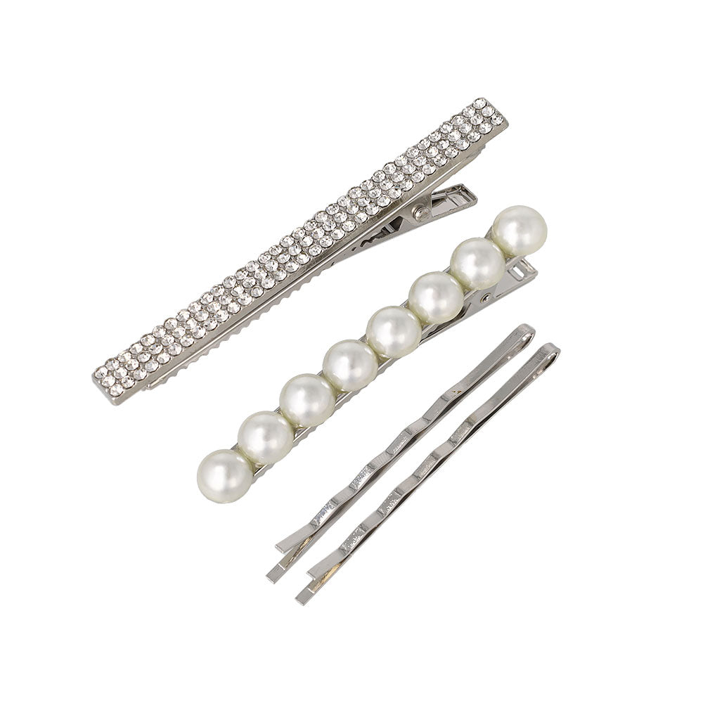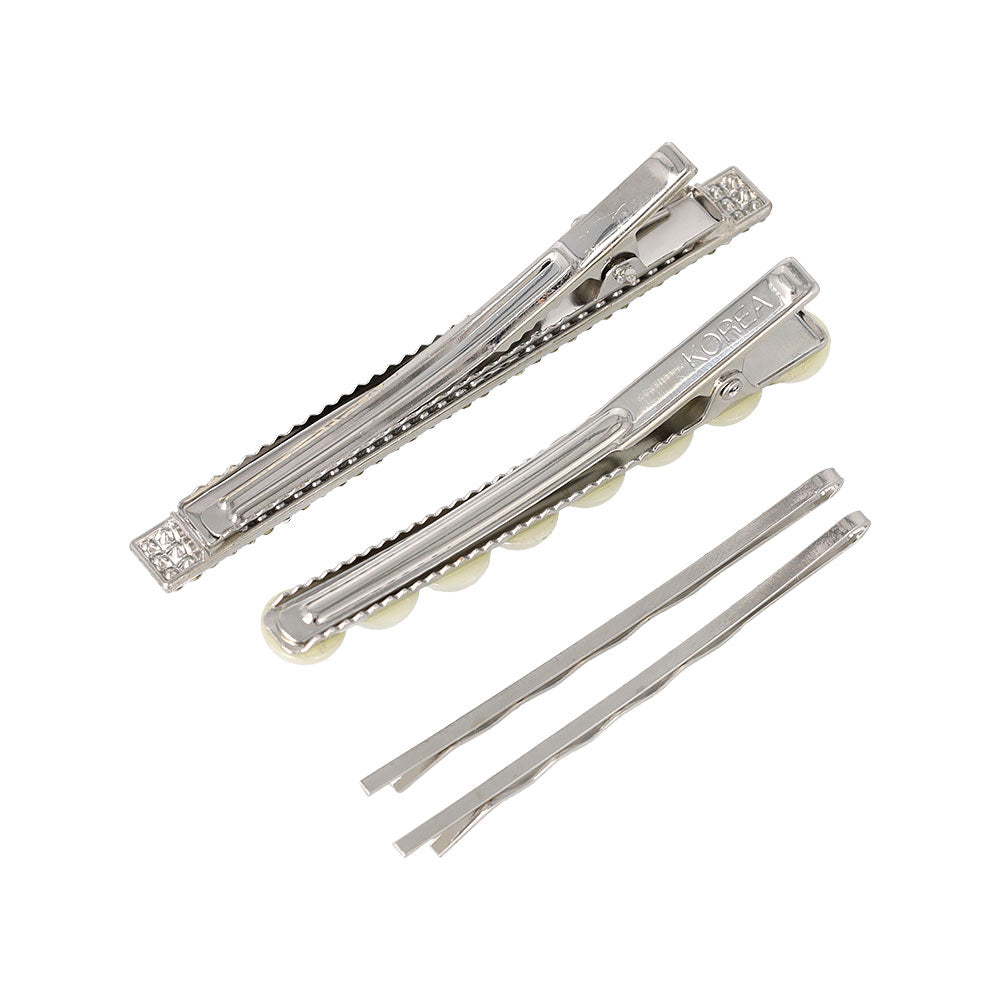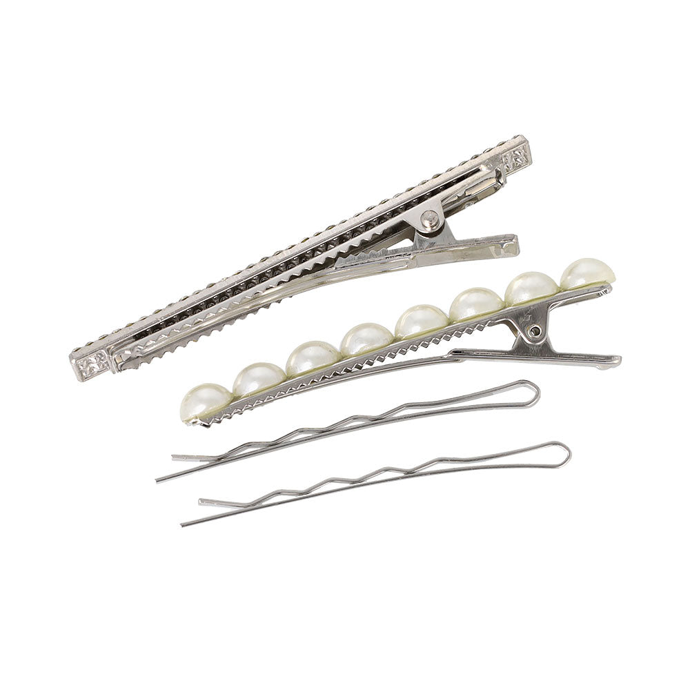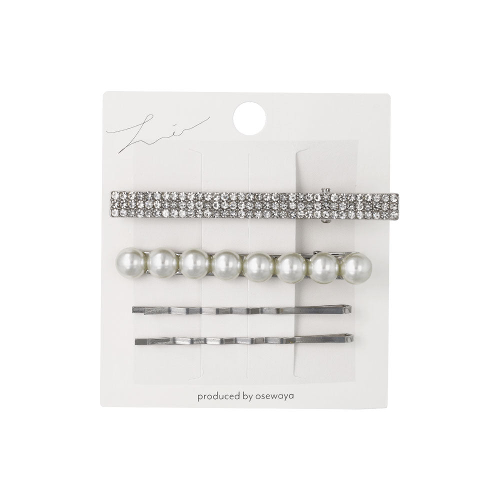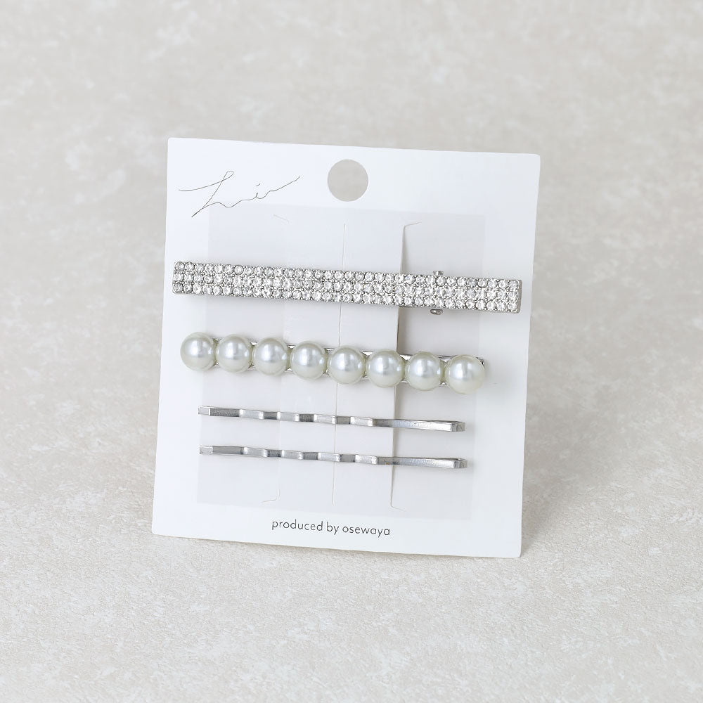 st0406パールとビジューを使ったシルバーベースのサイドクリップとアメピンのヘアアレンジセット。組み合わせが楽しめる4本セット。
