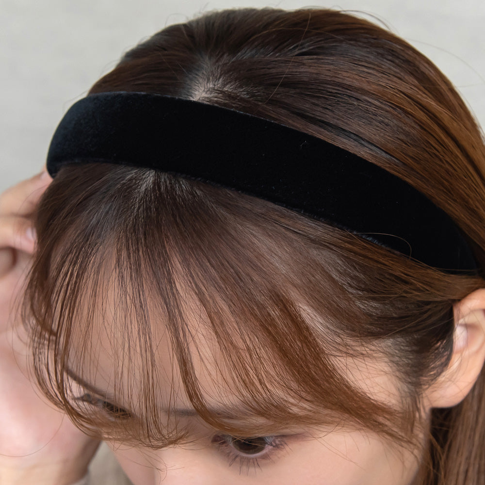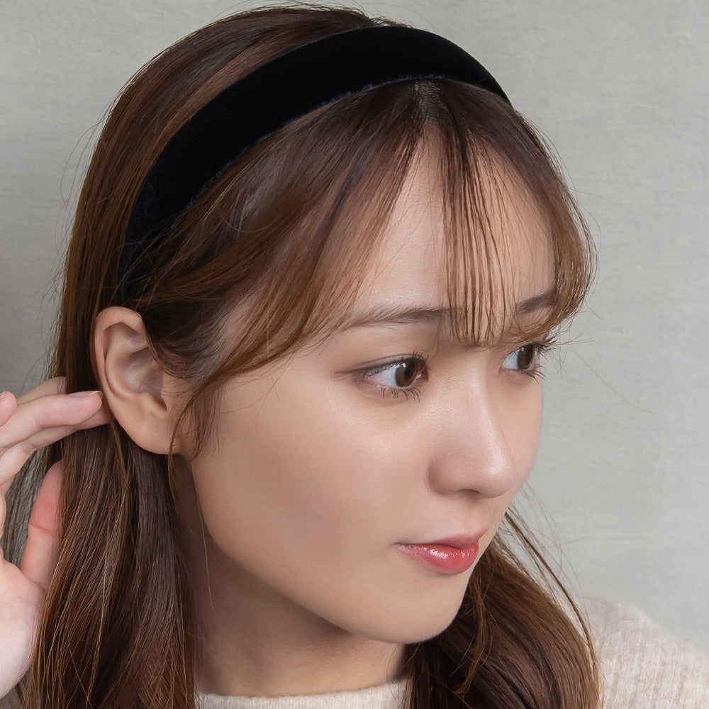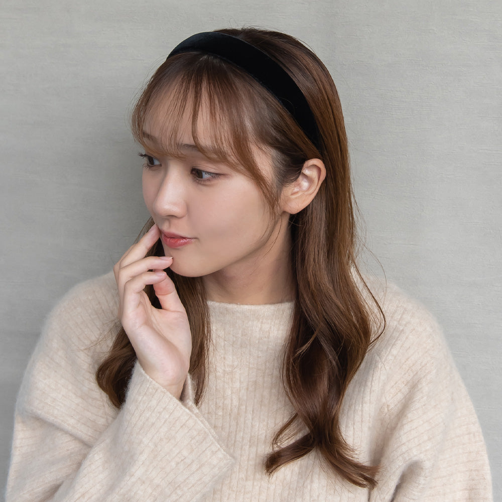 tk0357秋冬の装いに、ベロアの光沢をおひとつ。コーデの完成度を高めるならカチューシャをプラス。ブラックカラーで使い勝手抜群、幅広いコーデと好相性のアイテムです。
