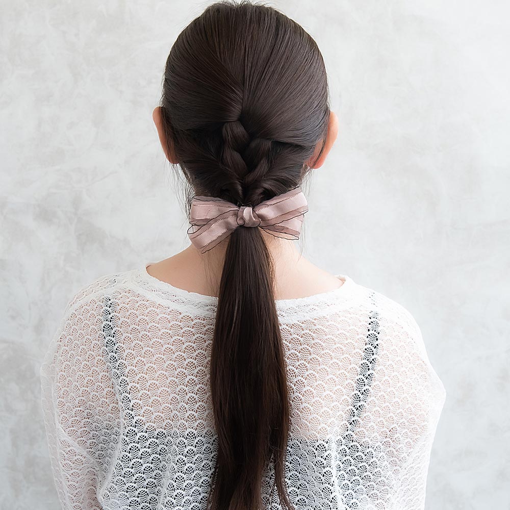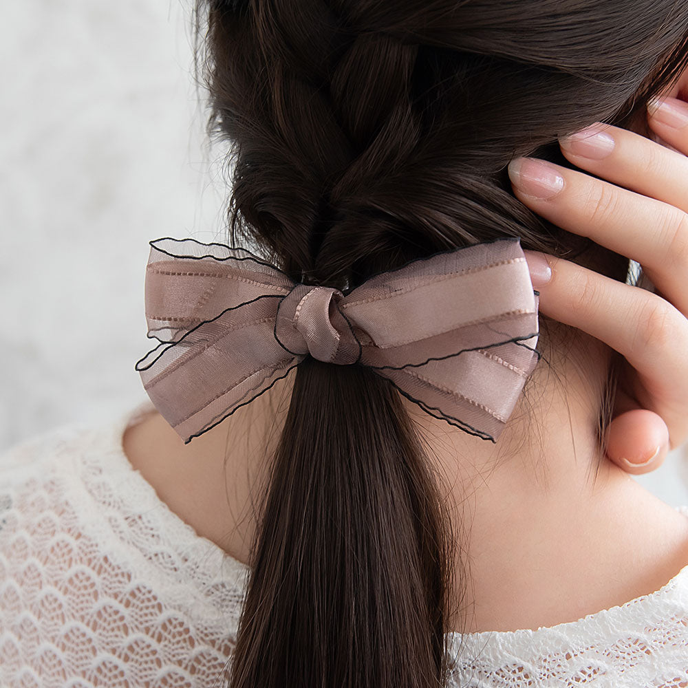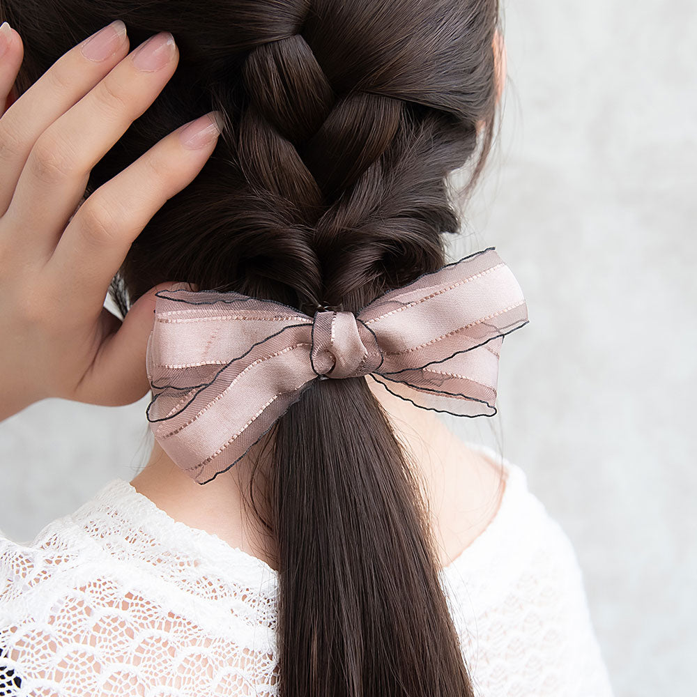 vt0383人気のくすみカラーが大人可愛いシアーリボンのバレッタ。軽い着用感のスリムバレッタタイプです。