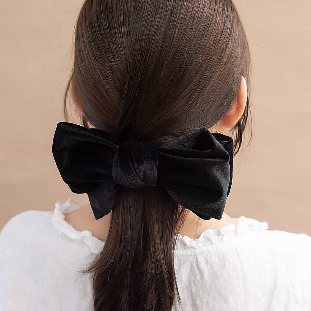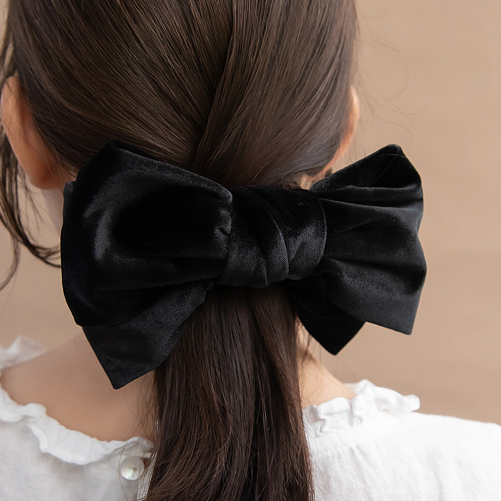 vt0394秋冬の装いに、ベロアの光沢をおひとつ。大きめリボンがキュートすぎ、ときめくビッグリボンバレッタ。主役級の可愛さ、幅広いコーデと好相性。大人コーデにプラスワン、気分がアガるトレンドアイテム。甘めのデザインもブラックカラーで使い勝手抜群◎