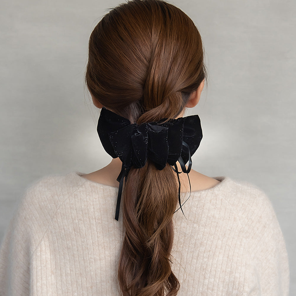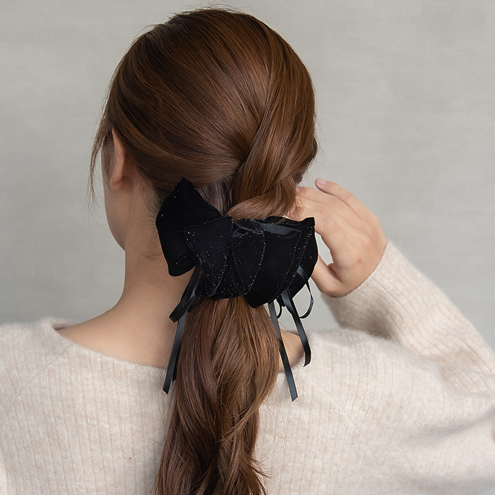 vt0395秋冬の装いに、ベロアの光沢をおひとつ。ラメアイテムで華やかに品よく。大きめフリル&ナローリボンでとってもキュートなバレッタ。主役級の可愛さ、幅広いコーデと好相性の優秀アイテム。大人コーデにプラスワン、気分がアガるトレンドアイテム。甘めのデザインもブラックカラーで使い勝手抜群◎