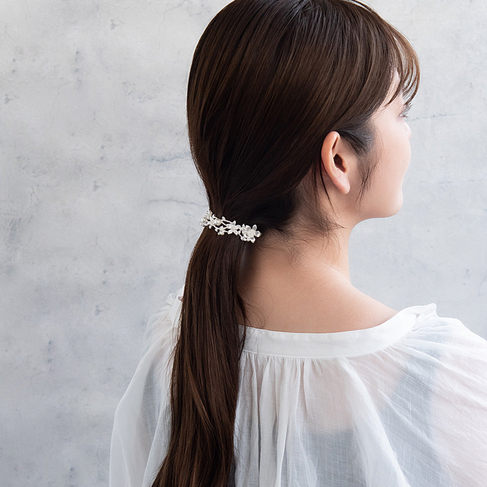 バレッタ ニッケルフリー メタル ボタニカル フラワー パール ストーン すべり止め付き サイズレスバレッタ