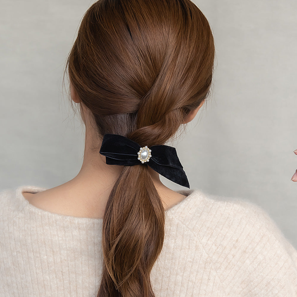 バレッタ アシンメトリー リボン ベロア パール ビジュー すべり止め付き サイズレスバレッタ