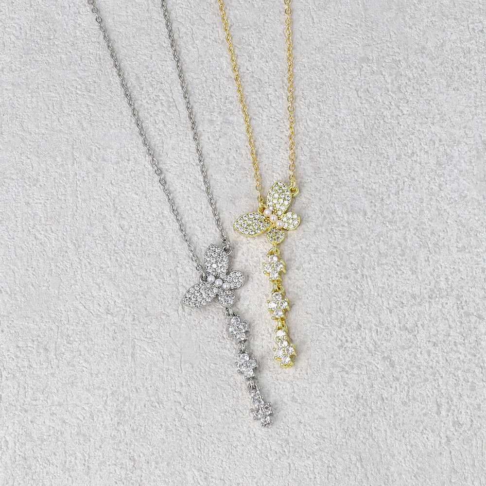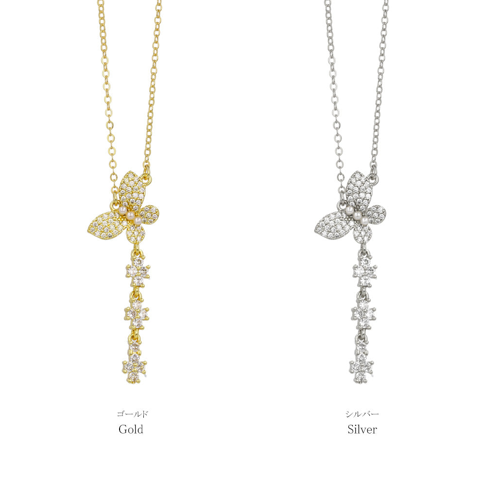 nk1203繊細なバタフライモチーフに、きらめくストーンとパールを組み合わせた華やかなネックレス。