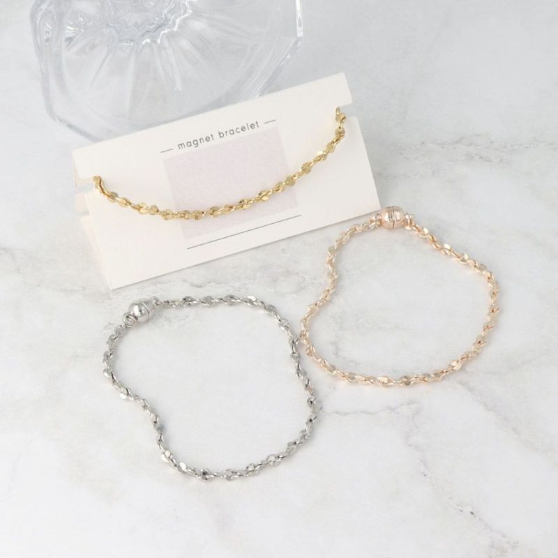 bl0520マグネット同士を近づけるだけ、磁石の留め具でラクにつけられるブレスレット。ひっかけるタイプの留め具が苦手な方や、ネイルアートをしている方にもおすすめです。機能性だけでなく、ファッションのポイントになるデザインも◎