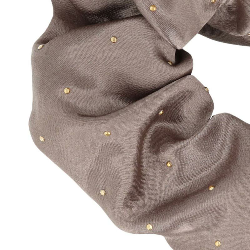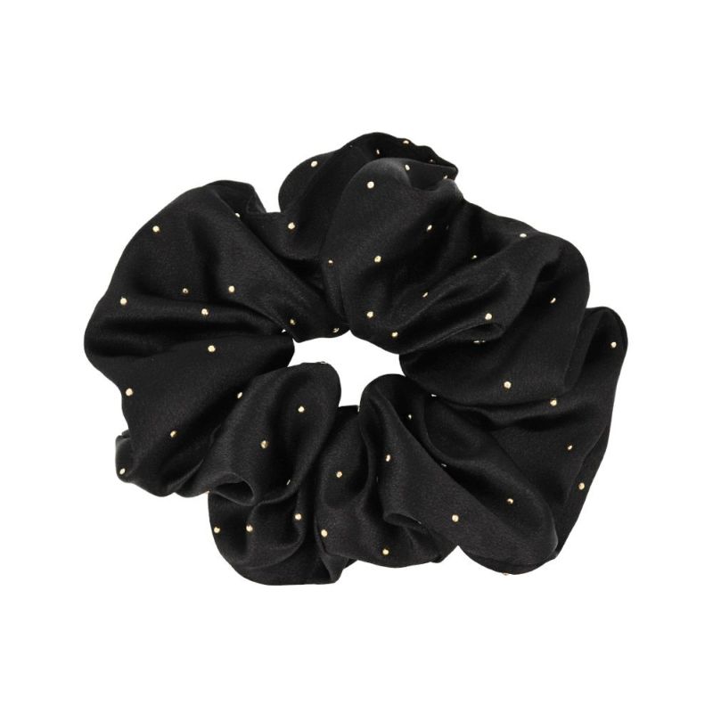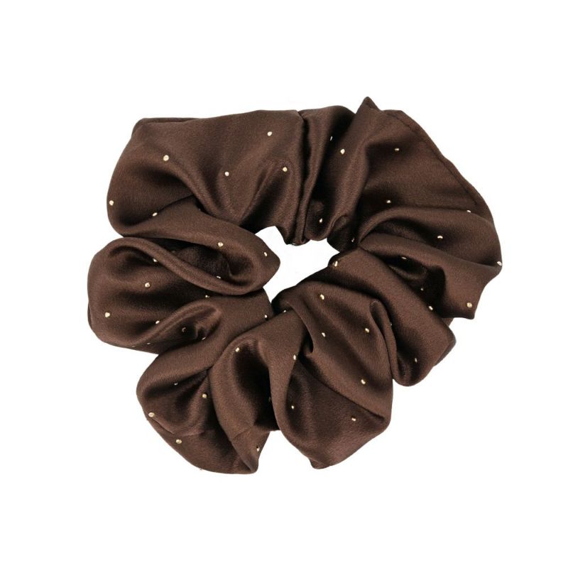 cc0180メタルのちいさなドットがアクセントになった、シンプルで使い勝手のよいシュシュ。軽い着け心地で、結び跡がつきにくく髪にやさしいアイテム。