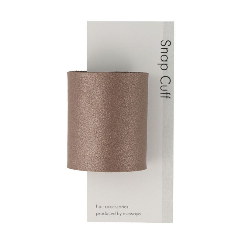 ロール部分を広げてヘアゴムの結び目にピンを挿します。髪をつつみながらスナップボタンを”パチン”と留めれば完成です。どこから見てもゴムの結び目が見えないのでキレイな仕上がりに。レザー風の質感が大人なスナップカフで、いつものポニーテールにきちんと感を。