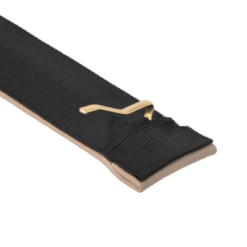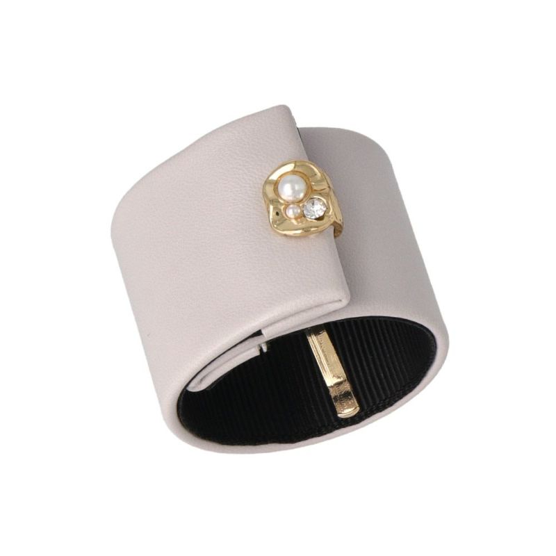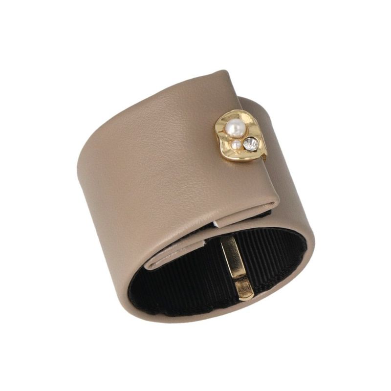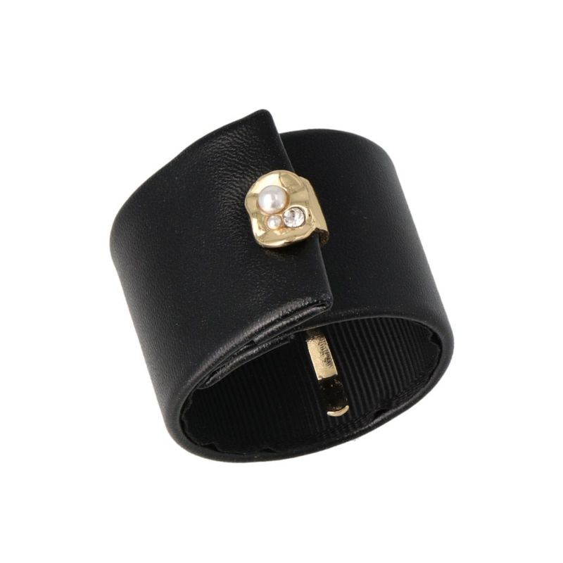 レザー風の素材をベースにメタルモチーフがアクセントにあしらわれたクラップカフ。オンオフともにつかえる上品なデザイン。