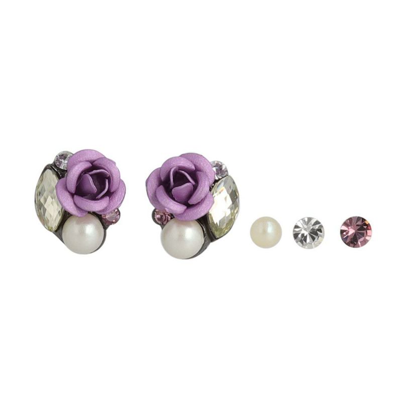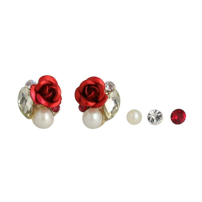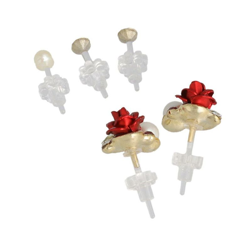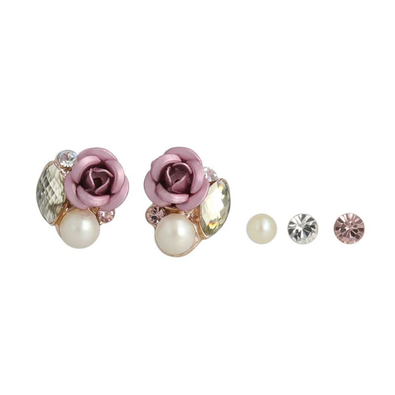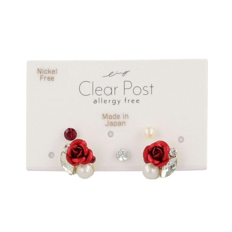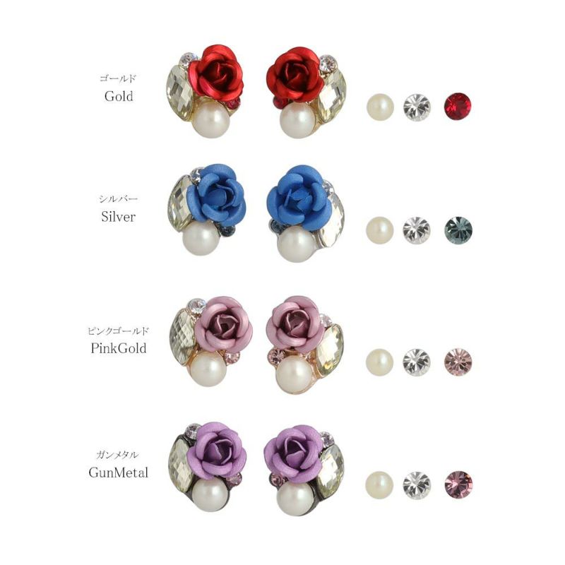 jp0654気品あるローズモチーフをメインにしたレディなピアスは、コンビネーションが楽しめる5個セット。耳元をパッとエレガントで華やかな印象に。