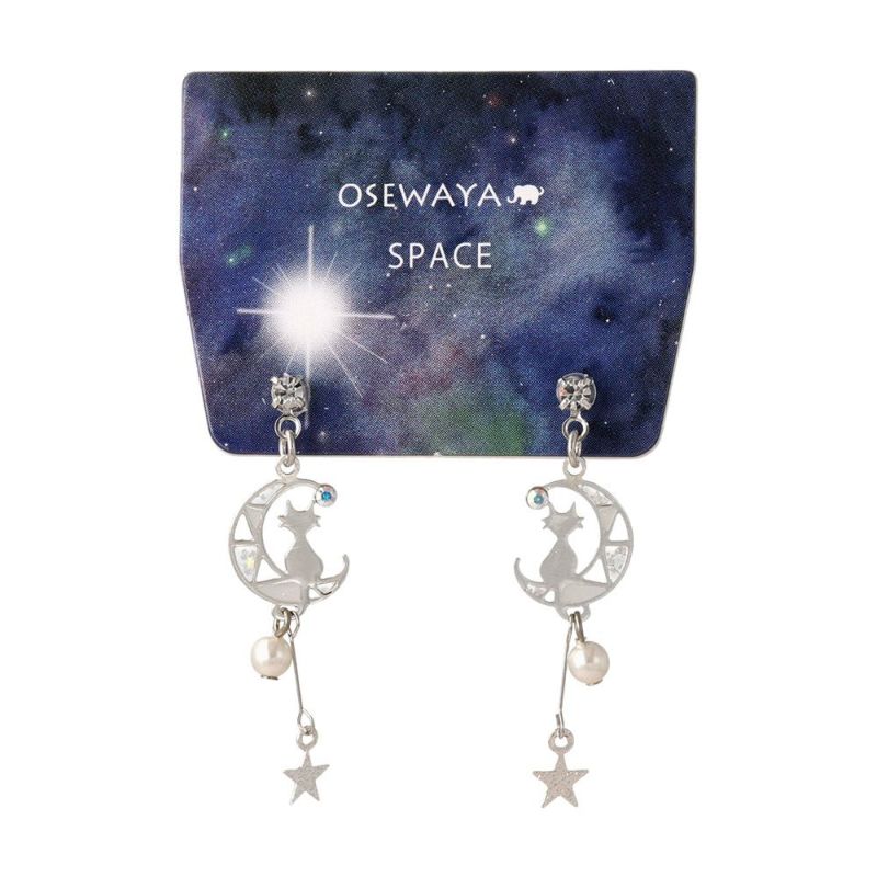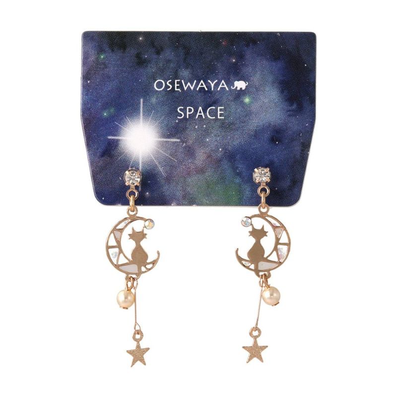ax1325猫好きさんのハートをわしづかみ。三日月にお座りする猫と星モチーフがさりげなくゆれるロマンチックなデザインのピアス。猫好きな方へのプレゼントにもお勧めです。