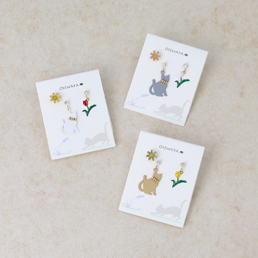 ax2058とにかく可愛い、おしゃれなネコちゃんのピアス。チューリップにマーガレット、お花見気分のネコちゃんが愛らしい。猫好きさんにおすすめしたい、鏡をみるたびにテンションの上がるアイテム。プレゼントにも◎