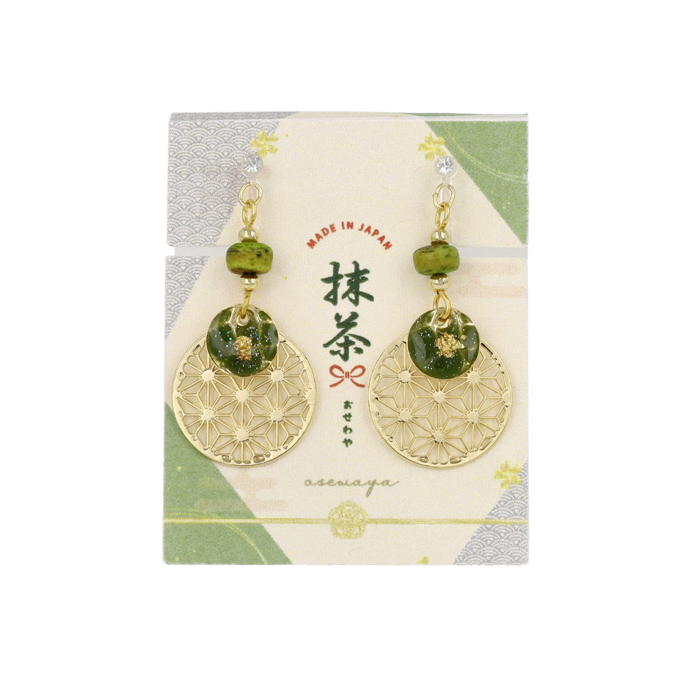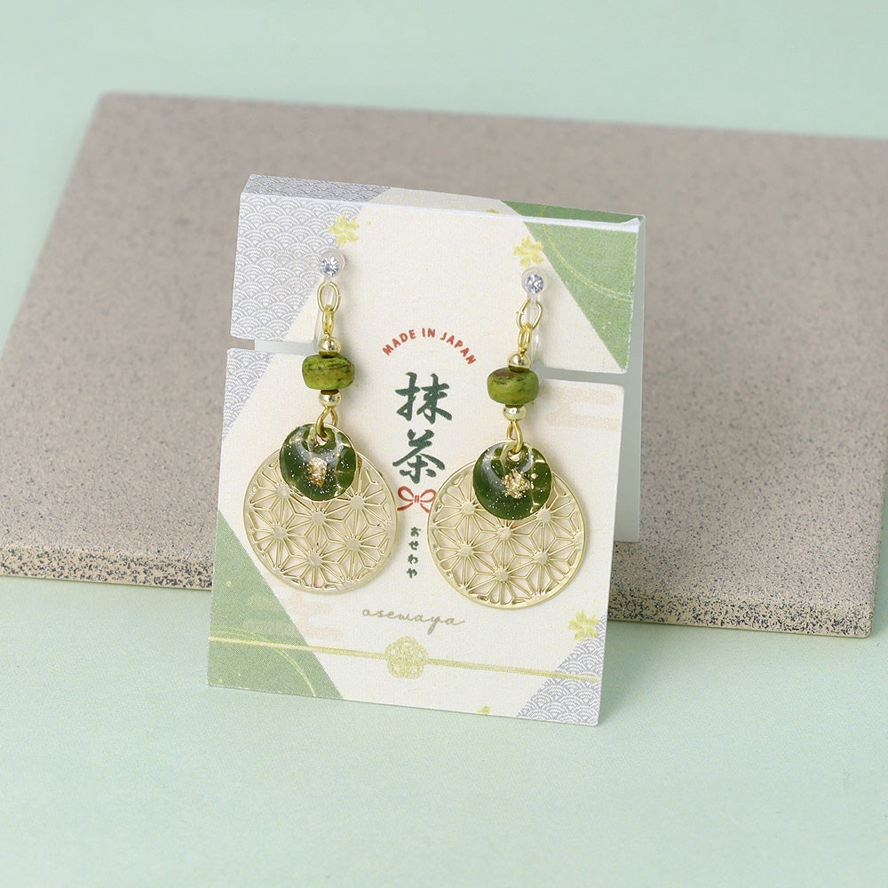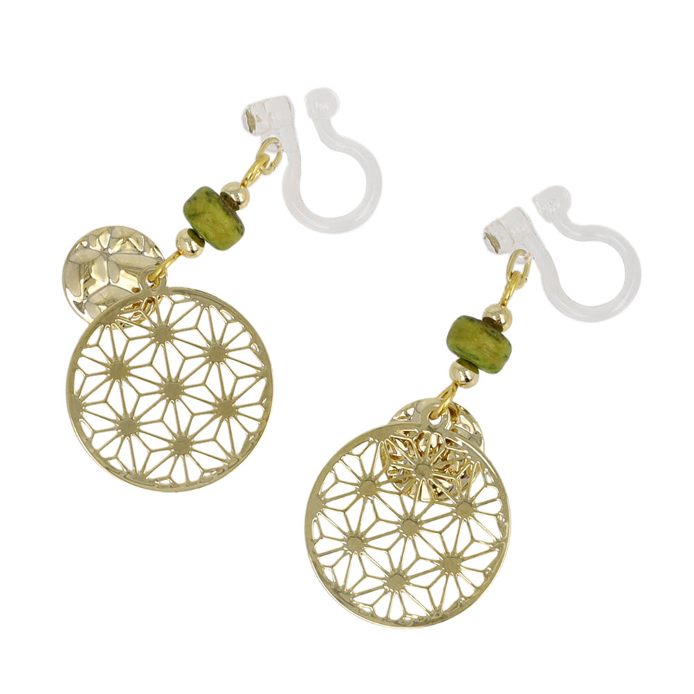 ノンホールピアス 抹茶 麻の葉文様 サークル ビーズ イヤリング 樹脂タイプ
