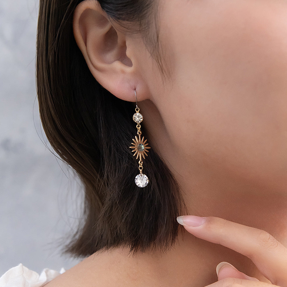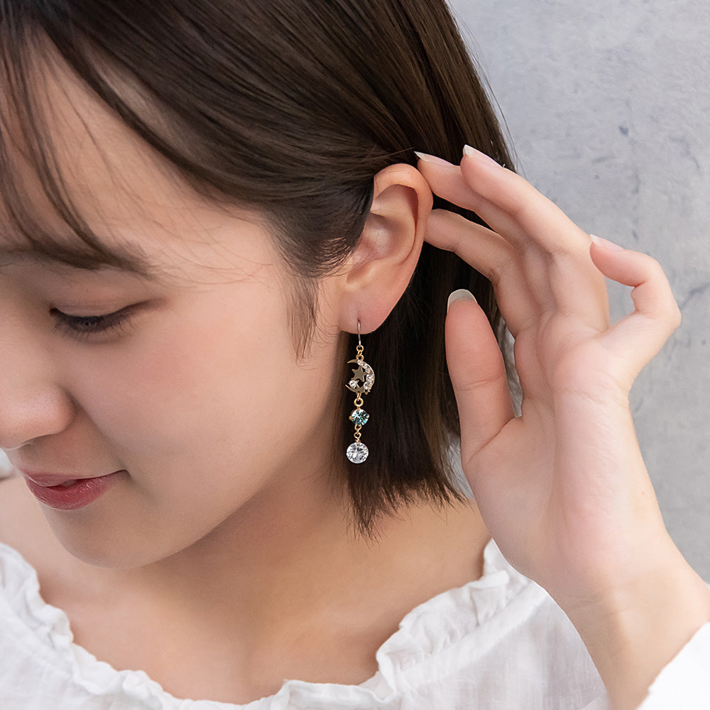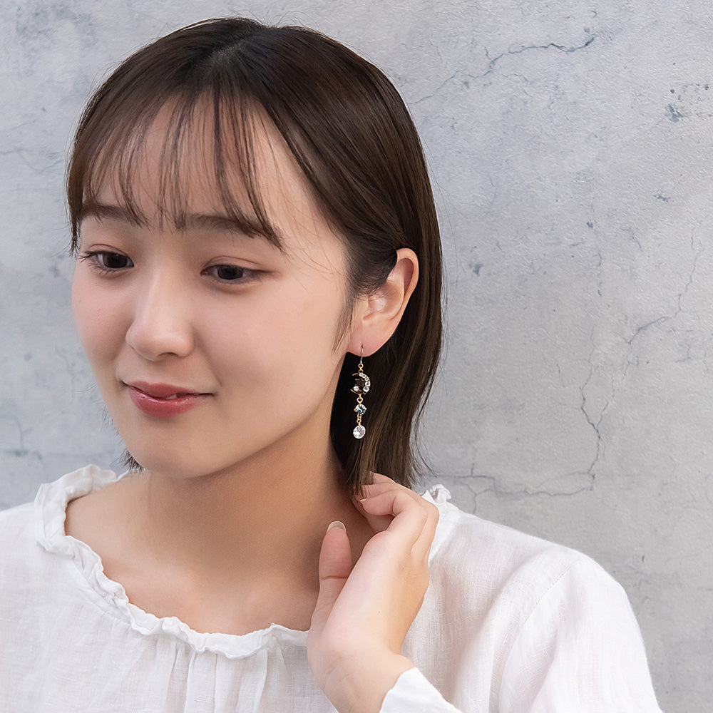 ax1407夜空に輝く、美しくロマンティックなギャラクシーデザイン。キラキラと輝く星たちの瞬き、神秘的に広がる宇宙を感じられるデザイン。人気のゆれるデザインで、耳元を華やかに演出します。さりげないゆれ感もかわいく、存在感もあってコーデ映え。
