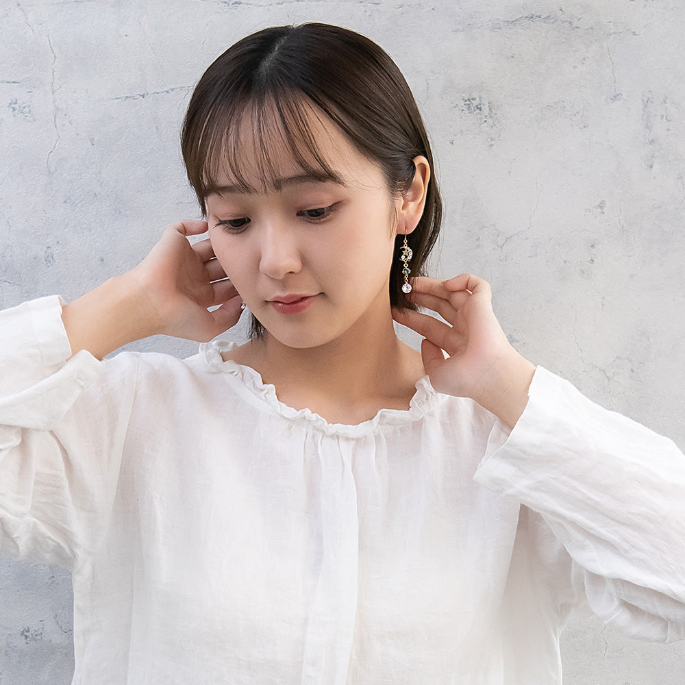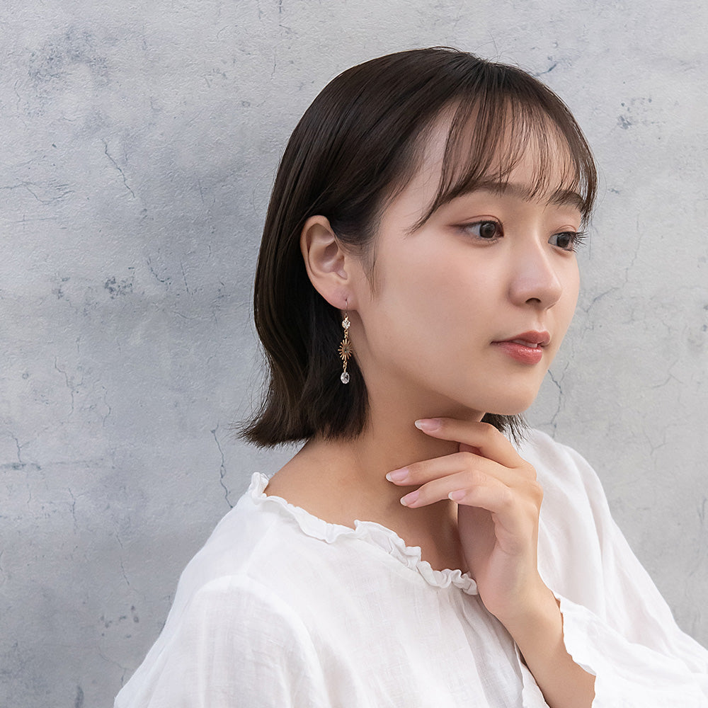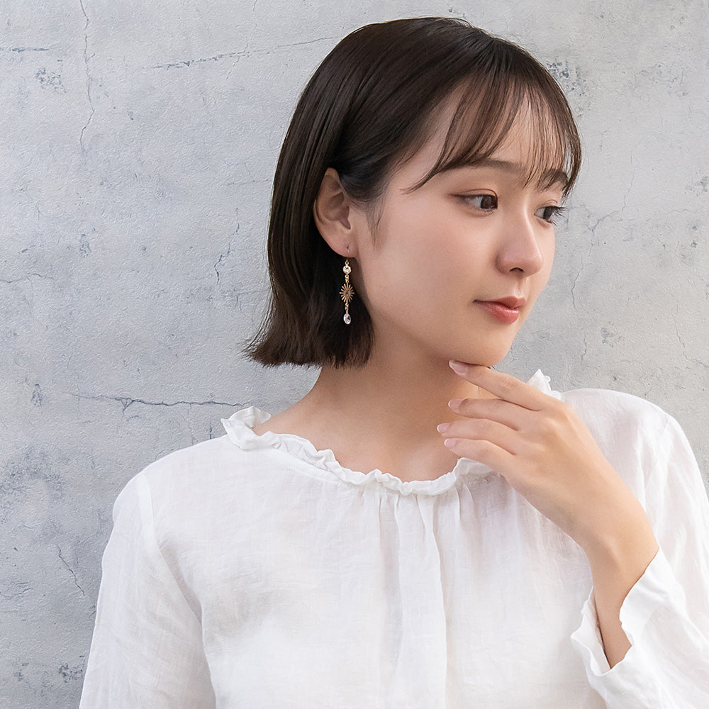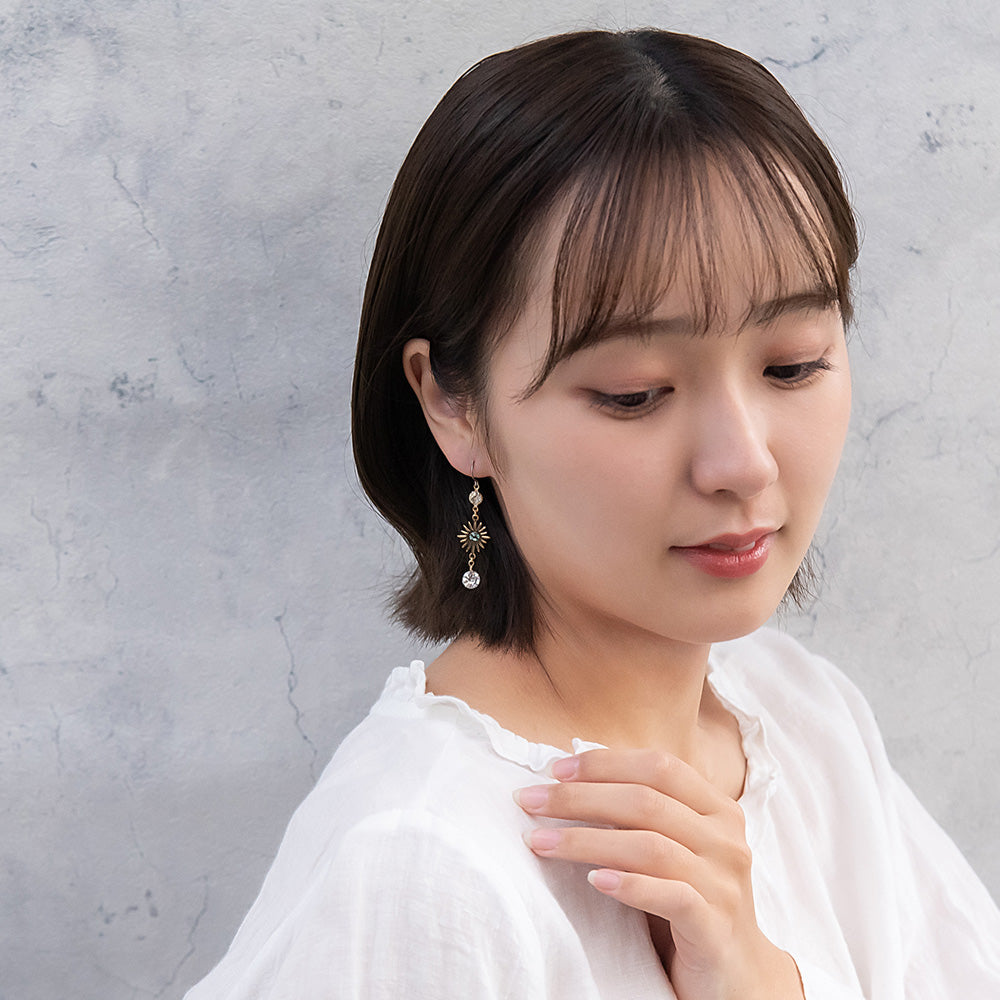 ax1407夜空に輝く、美しくロマンティックなギャラクシーデザイン。キラキラと輝く星たちの瞬き、神秘的に広がる宇宙を感じられるデザイン。人気のゆれるデザインで、耳元を華やかに演出します。さりげないゆれ感もかわいく、存在感もあってコーデ映え。