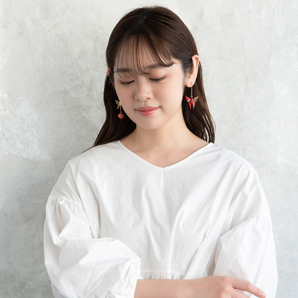 ax3096和風のモチーフを美しくアレンジした蝶とトンボ玉のピアス。ハンドメイドの折り紙アクセサリーは、細部までこだわった工芸品のよう。人気の和風モチーフはプレゼントにも喜ばれます。着物や浴衣などの装いにもおすすめです。
