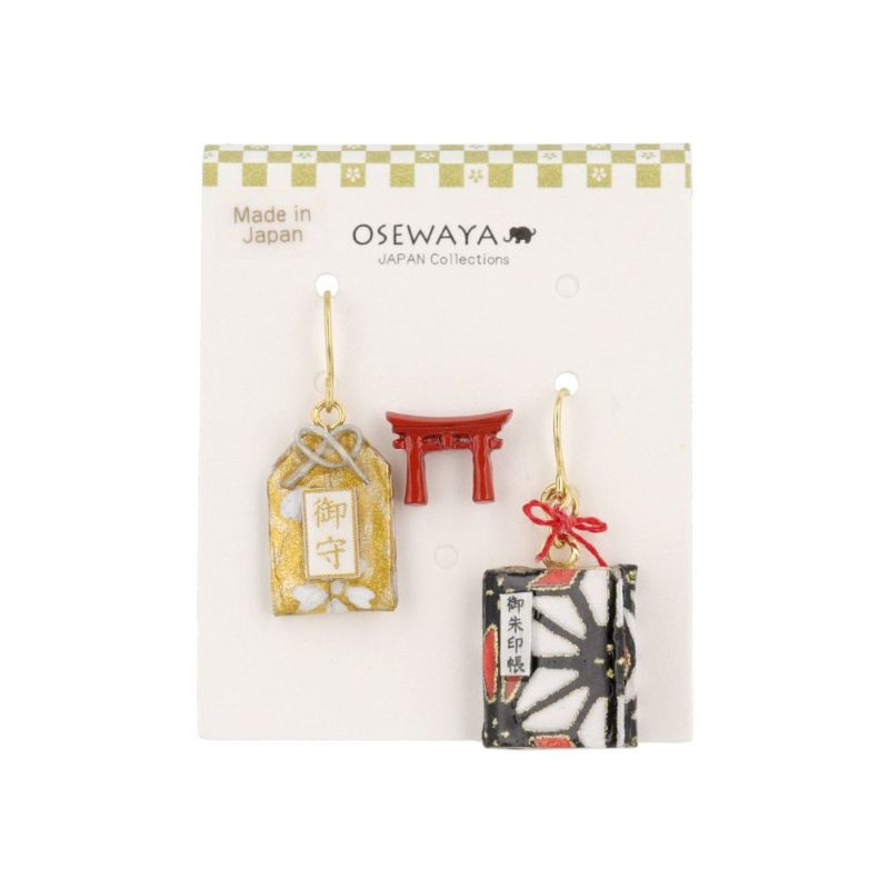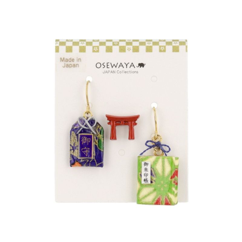 ax3216御守り、御朱印帳、鳥居がセットになった日本モチーフのセットピアスは、気分に合わせて楽しめる3個セット。ミニチュアの世界観がお好きな方にお勧めです。