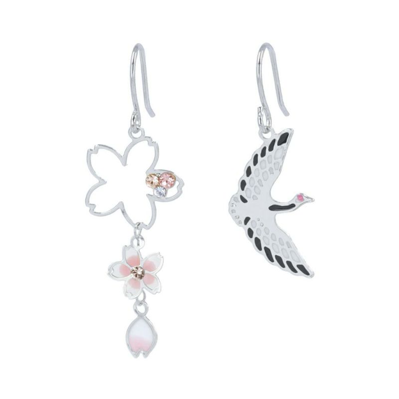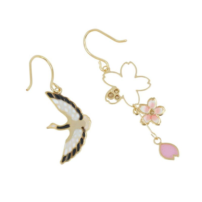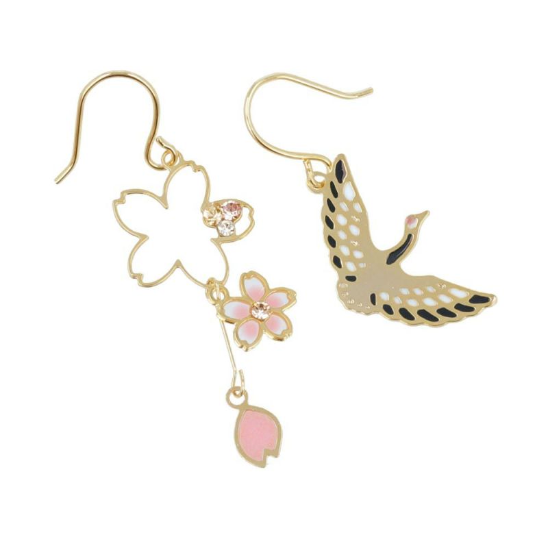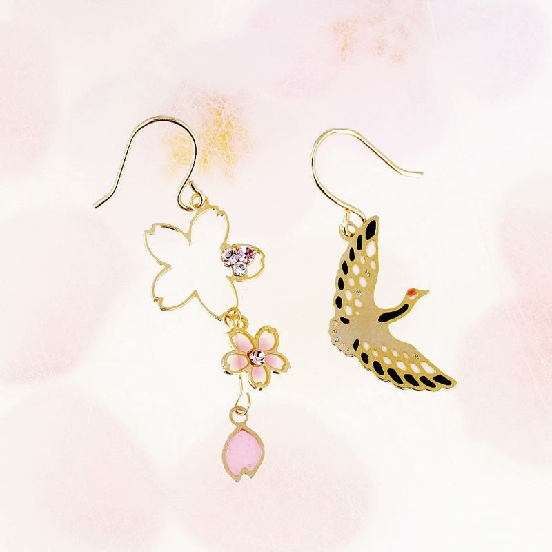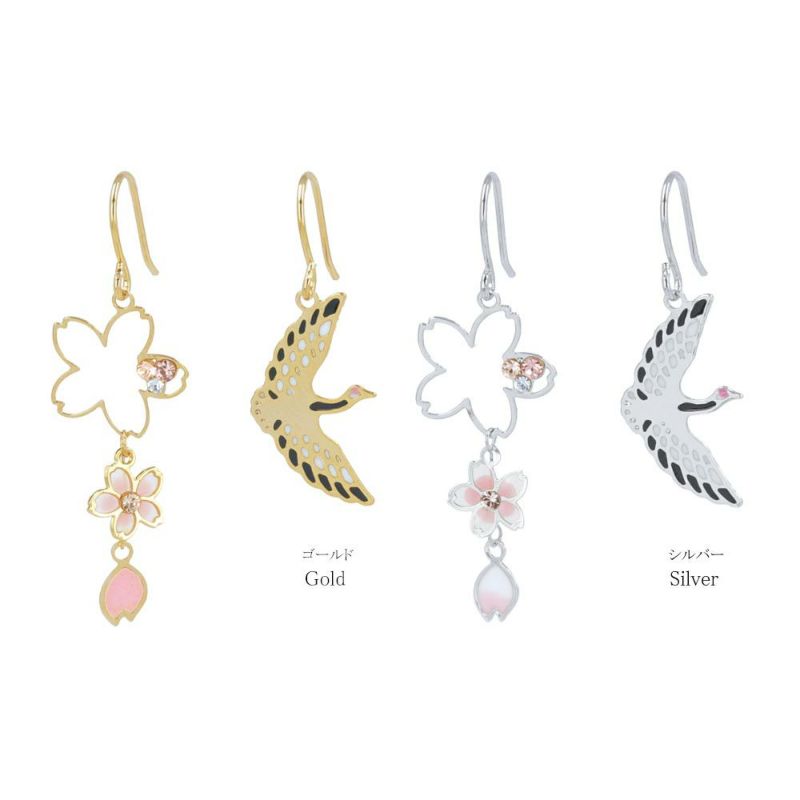 和風のモチーフを美しくアレンジしたピアスは、花びら舞う桜と鶴がゆれる可愛らしいデザイン。大人気の和風モチーフは、見ているだけで楽しく、季節問わず使えるのでプレゼントにもオススメです。
