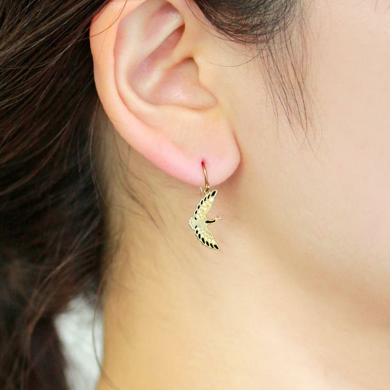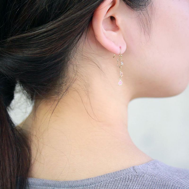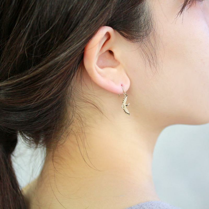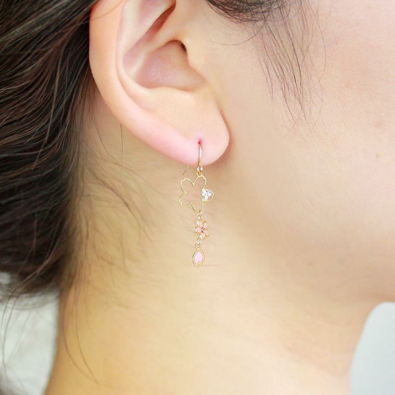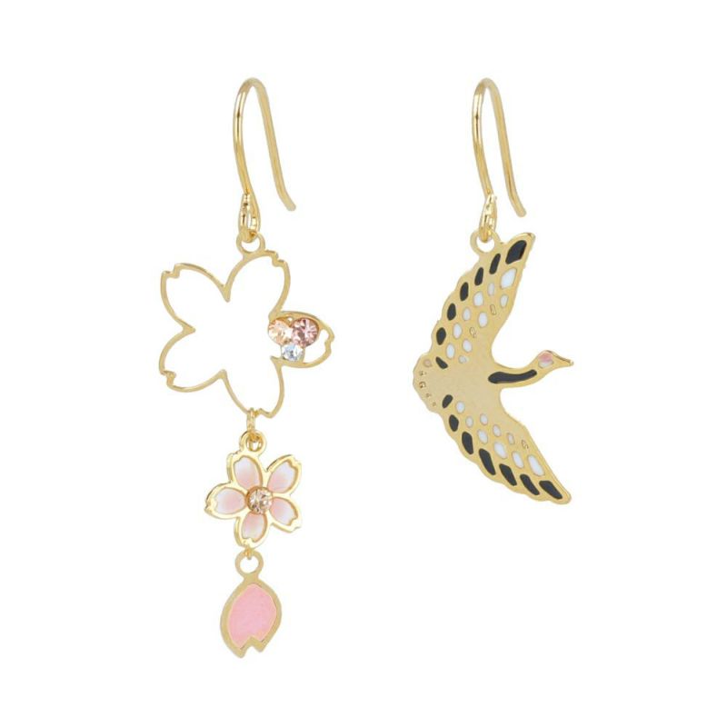 和風のモチーフを美しくアレンジしたピアスは、花びら舞う桜と鶴がゆれる可愛らしいデザイン。大人気の和風モチーフは、見ているだけで楽しく、季節問わず使えるのでプレゼントにもオススメです。